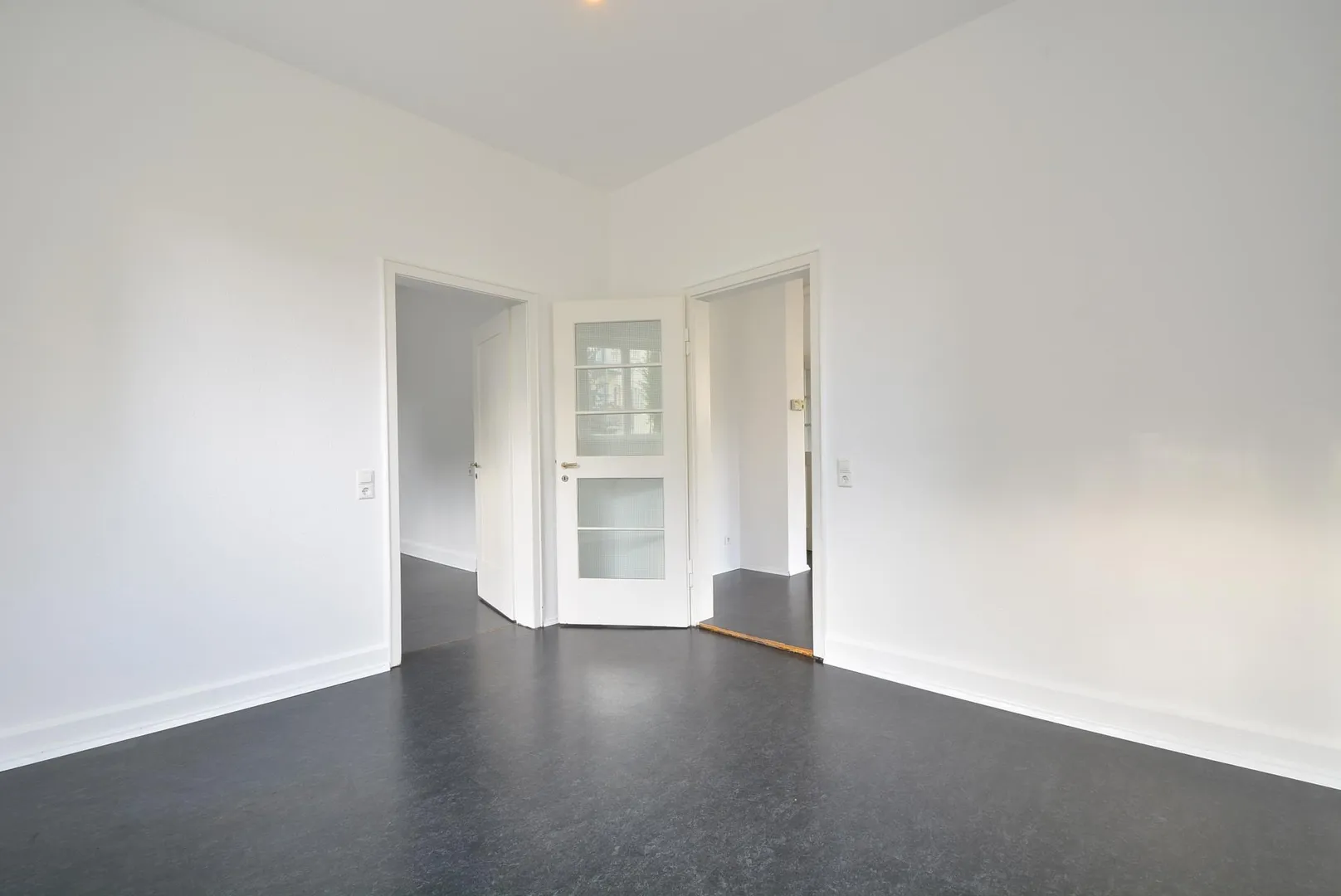 In Flur und den drei Räumen ist anthrazitfarbener PVC-Boden verlegt, in Küche und Bad Fliesenboden.