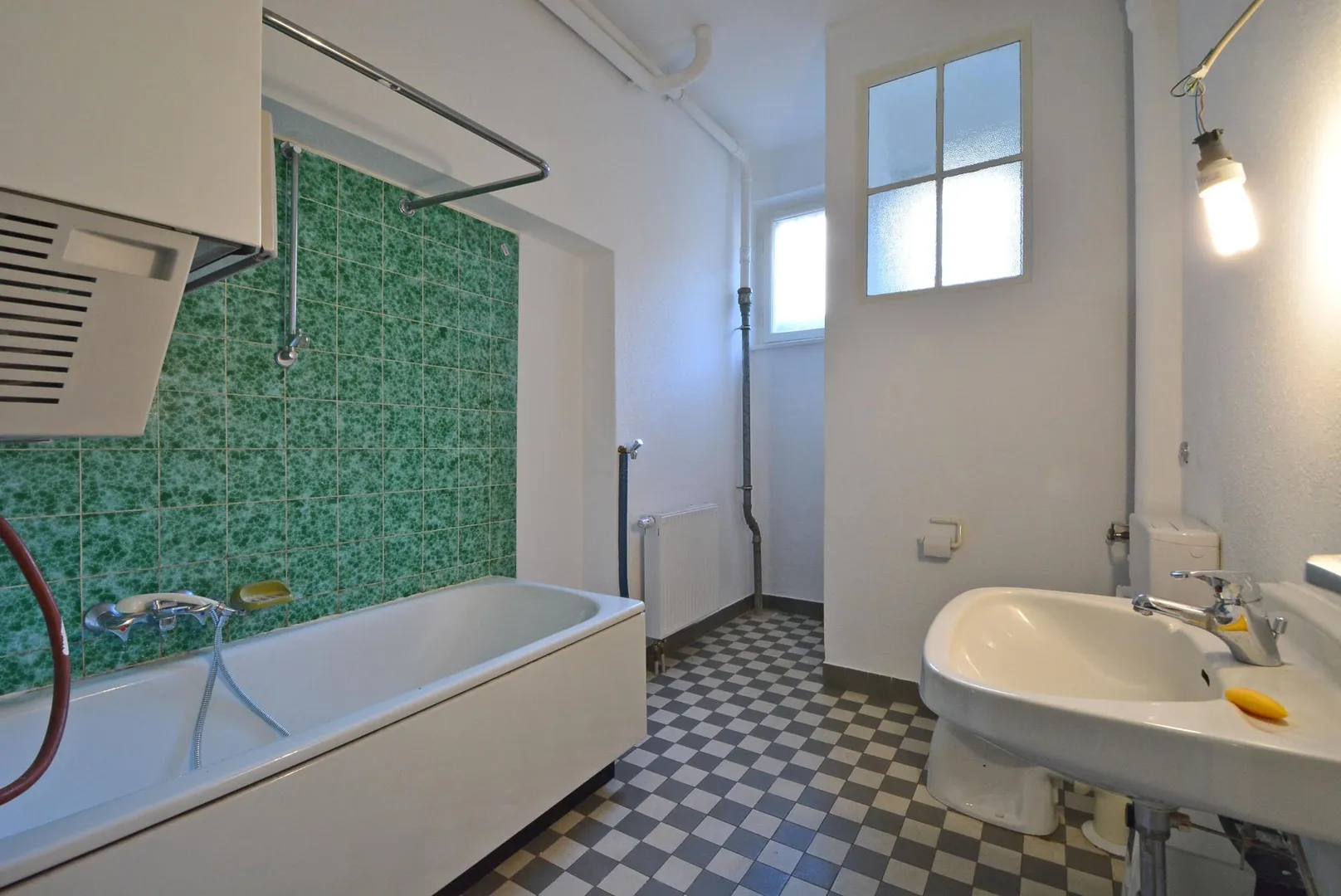 Direkt nebenan befindet sich das Bad. Es ist ausgestattet mit Badewanne, Waschbecken und WC. Auch eine Waschmaschine kann hier angeschlossen werden.
