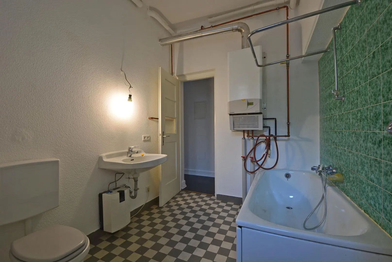 Direkt nebenan befindet sich das Bad. Es ist ausgestattet mit Badewanne, Waschbecken und WC. Auch eine Waschmaschine kann hier angeschlossen werden.