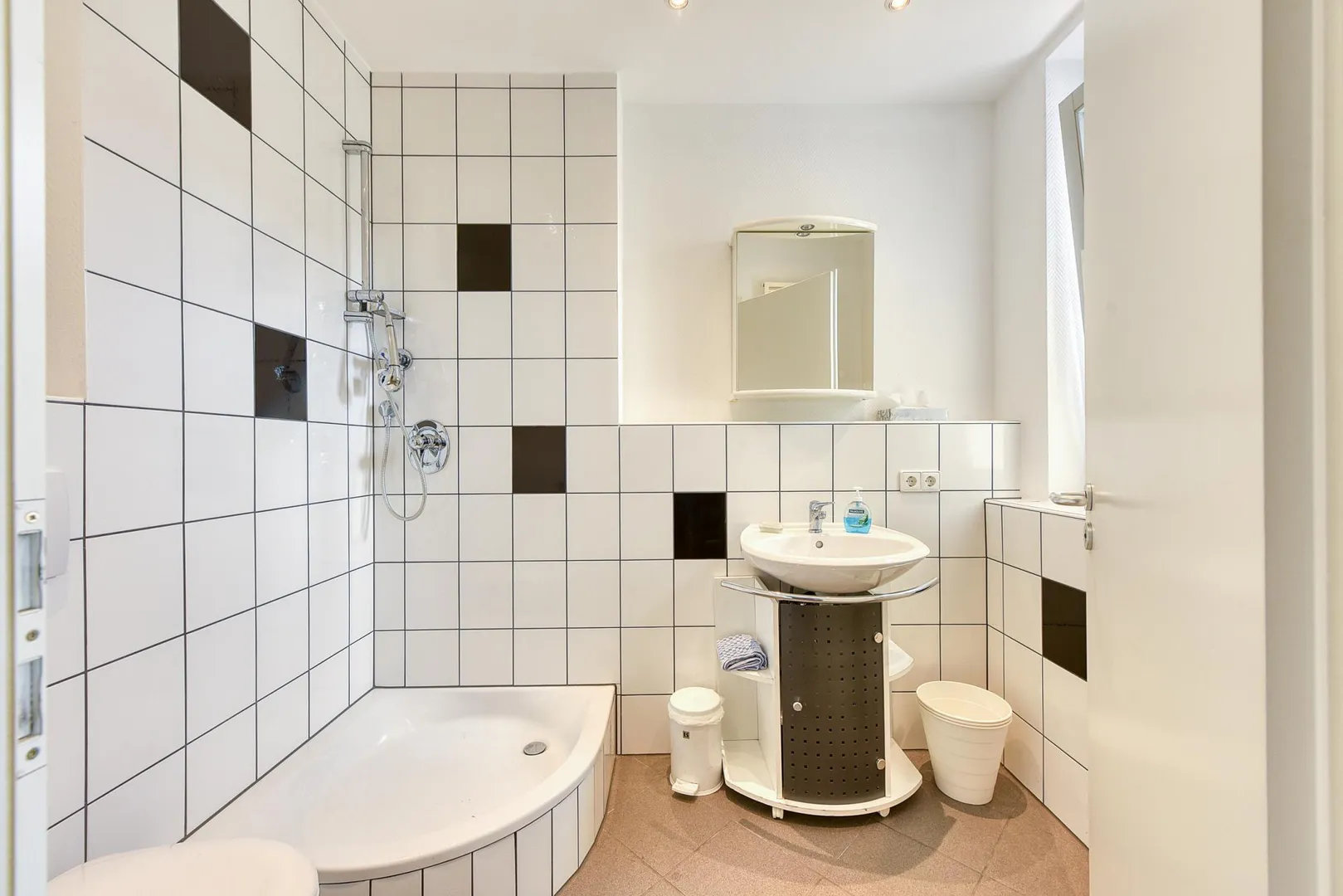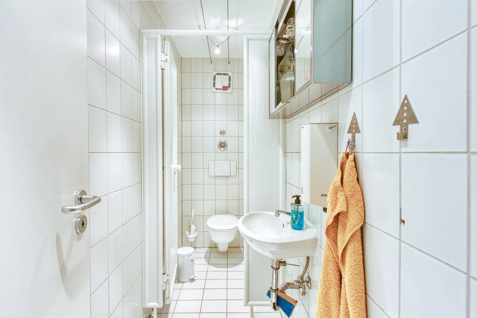Das Badezimmer mit Fenster befindet sich im vorderen Bereich der Einheit und ist ausgestattet mit einer Dusche sowie einem WC. Im hinteren Bereich der Einheit befindet sich ein zweites WC.