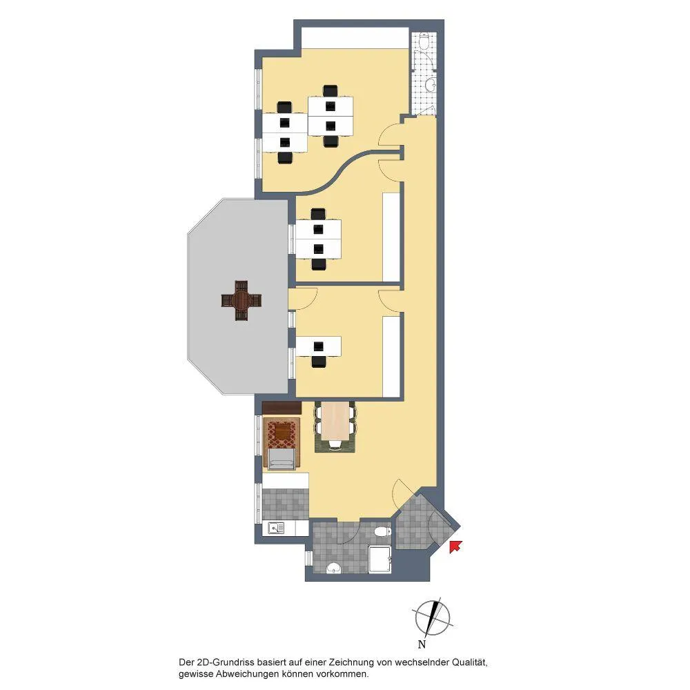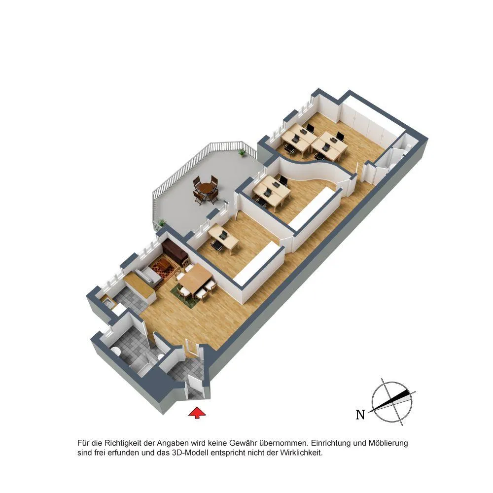 Der Grundriss ist offen und länglich gestaltet. Über einen Windfang (Eingangsbereich) geht es zum offenem Empfangsbereich mit offener Einbauküche sowie zum offenem Flur. Über den Empfang geht es in ein Badezimmer/WC mit Fenster. Über den Flur geht es zu drei Büroräumen sowie zum zweiten WC.
