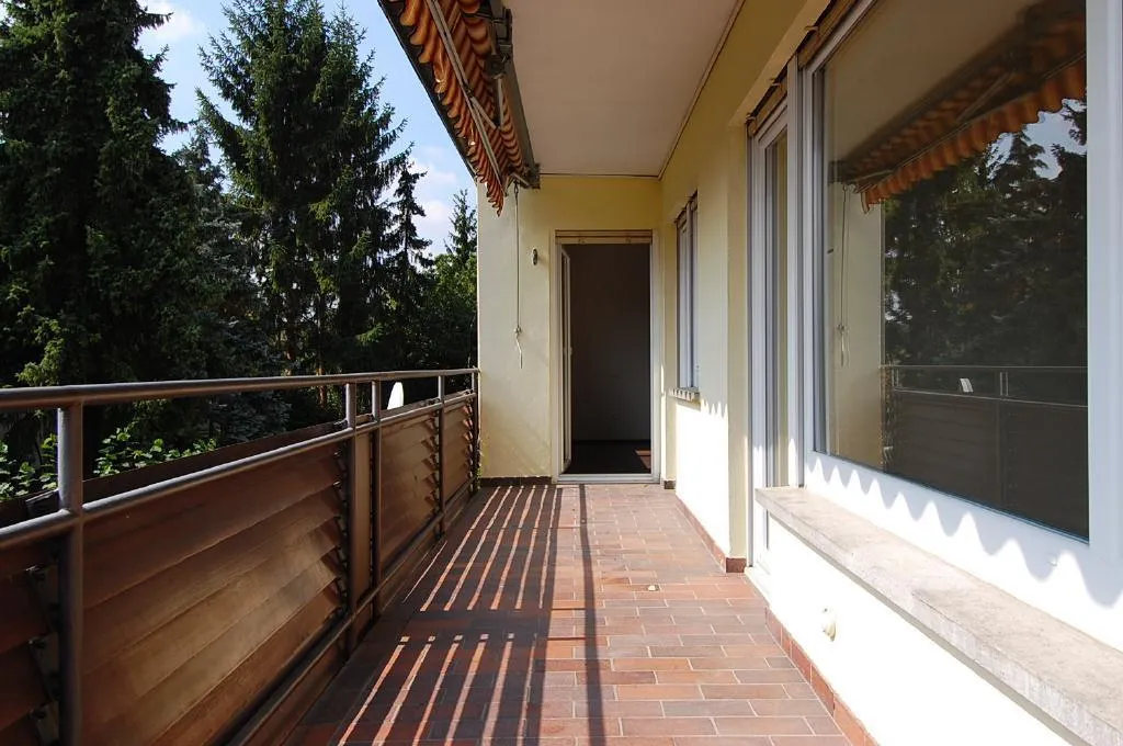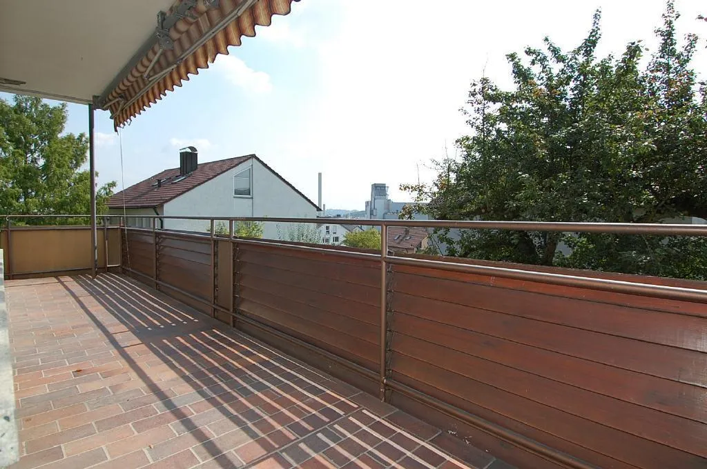 Der überdachte Süd-Balkon ist ca. 12 m² groß (8 Meter x 1,5 Meter), ist von allen Zimmern begehbar und ist mit einer manuellen Markise ausgestattet.