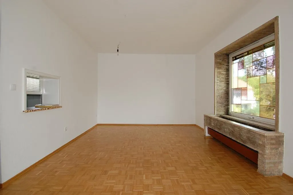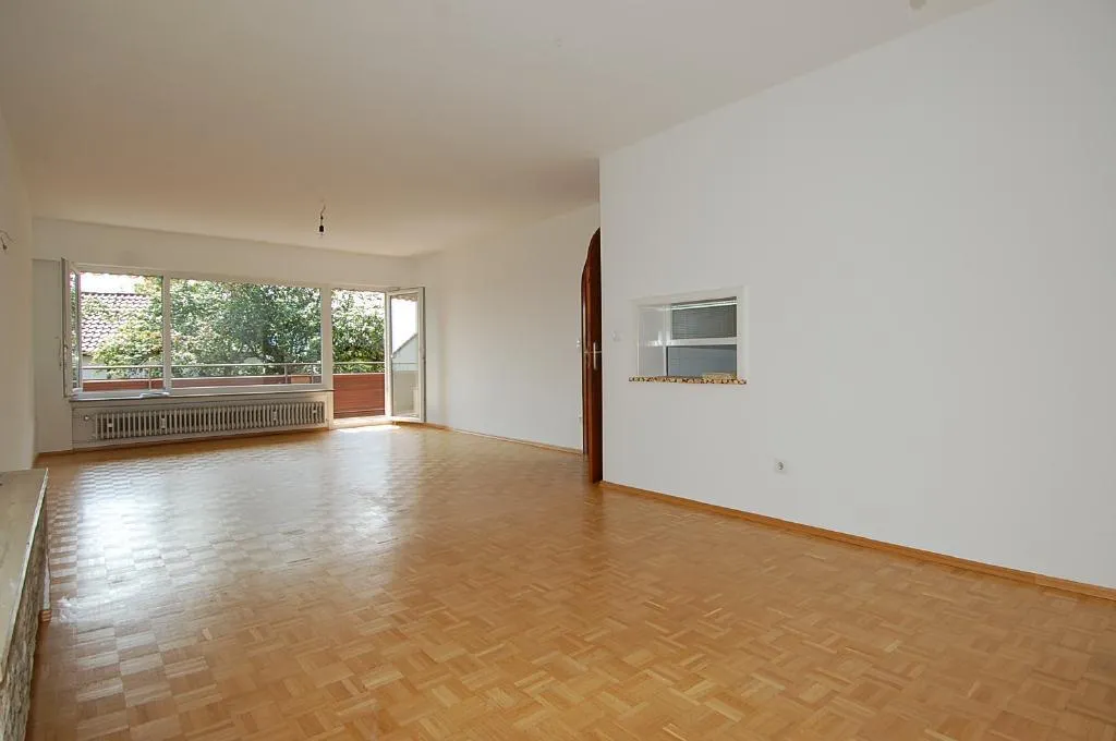 Das ca. 36 m² große Wohn-Esszimmer ist mit Parkett ausgestattet und verfügt über eine Durchreiche zur Küche. Der Parkett ist aktuell abgeschliffen und frisch versiegelt worden.