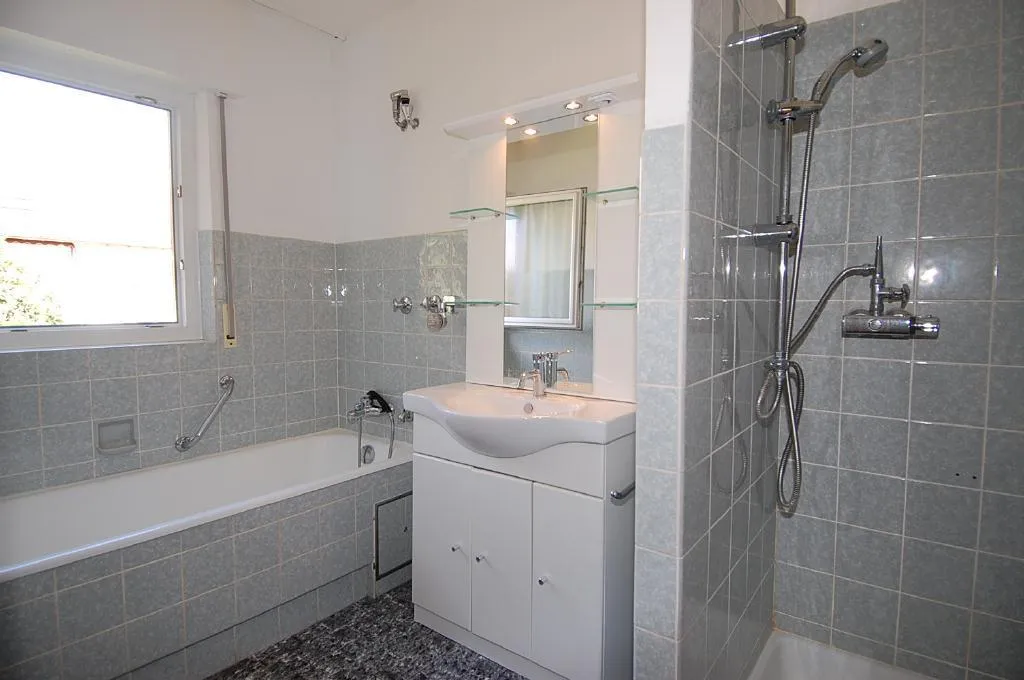 Das ältere Tageslicht-Badezimmer ist halbhoch gefliest und verfügt über einen Fliesenboden, eine Dusche, eine Wanne und ein Fenster.