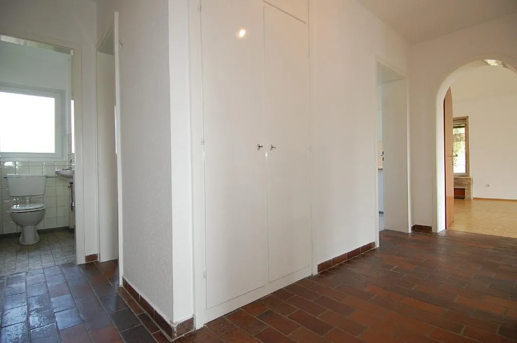 Der Flur ist mit einem Fliesenboden in Ziegelsteinoptik und einem Einbauschrank ausgestattet.