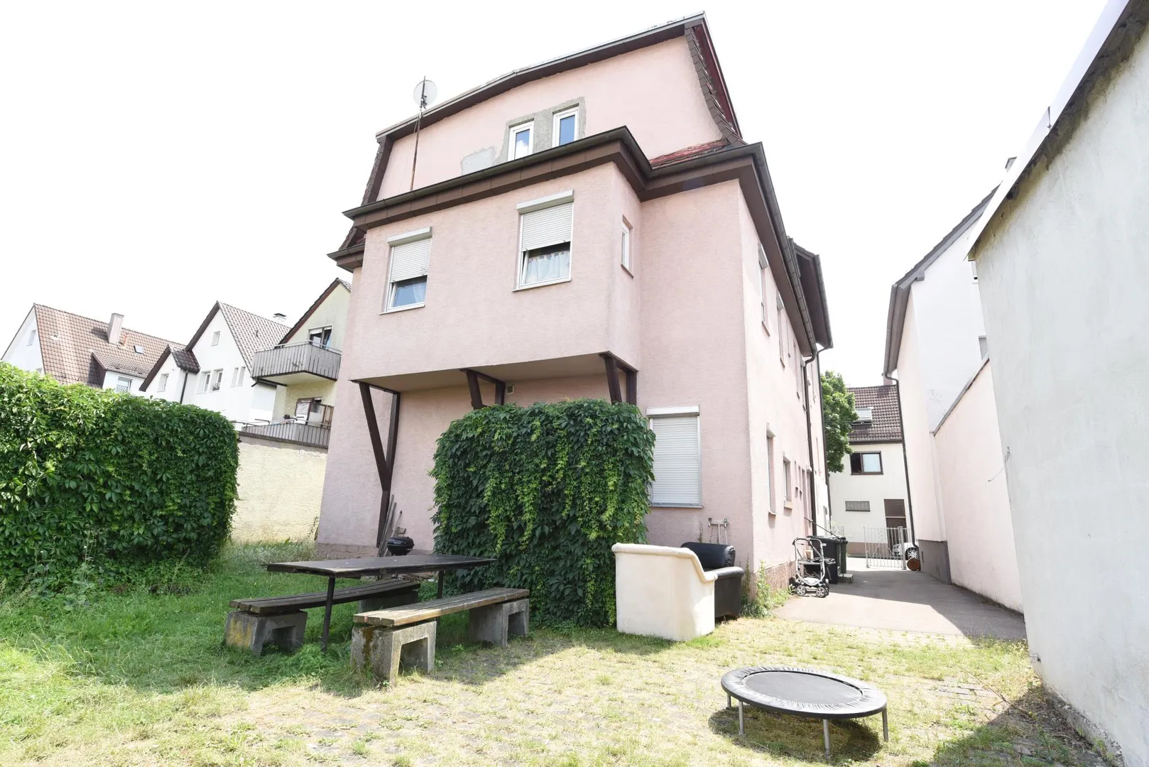 Das Grundstück ist eben und fast rechteckig. Das Haus wurde im vorderen Bereich direkt an die Grundstücksgrenze gebaut. Im hinteren Bereich befindet sich der Garten.