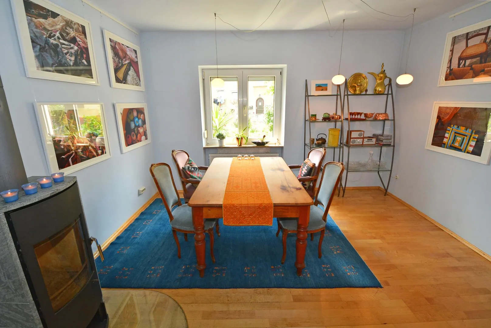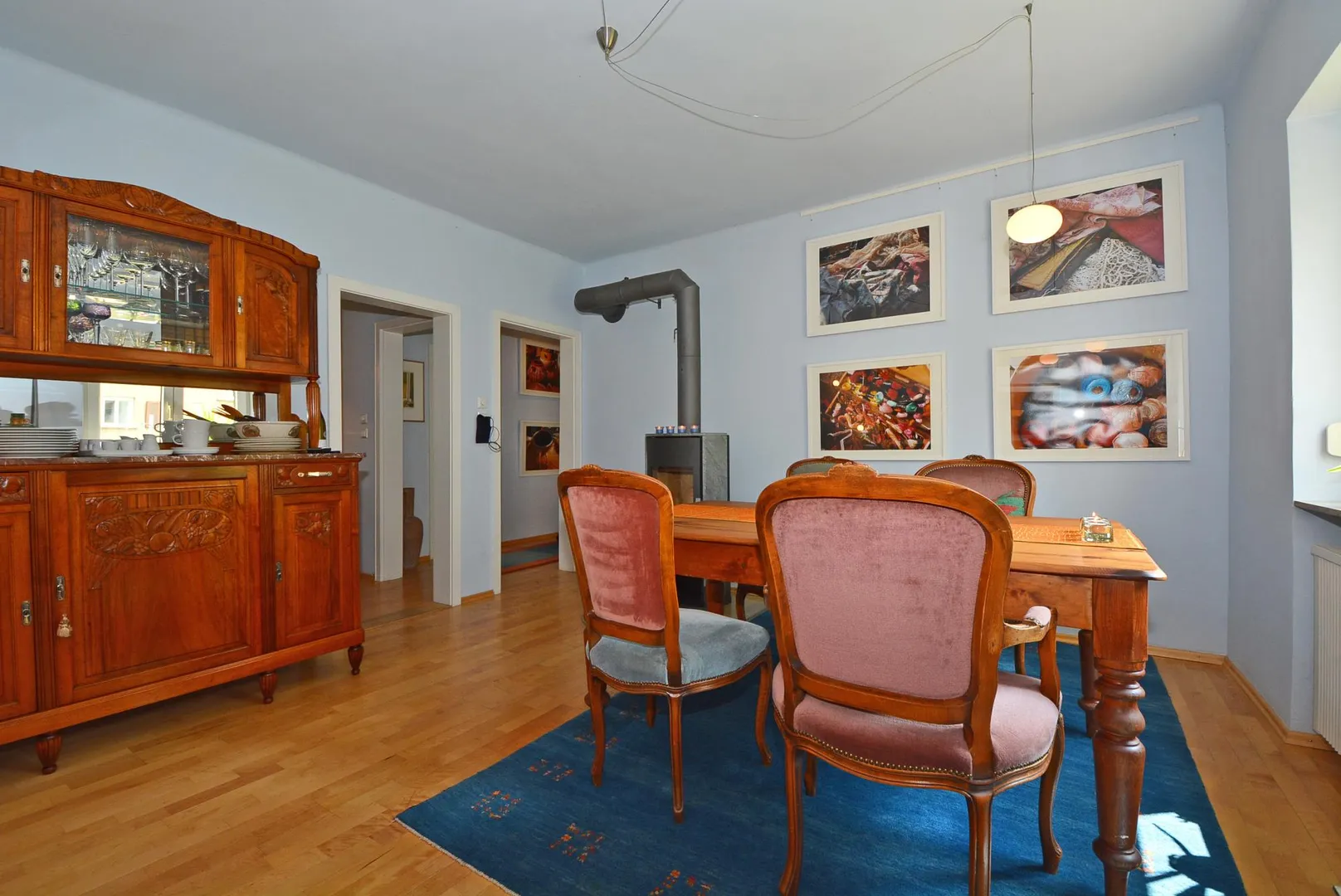 Ein Highlight im Esszimmer ist der holzbefeuerte Kaminofen.