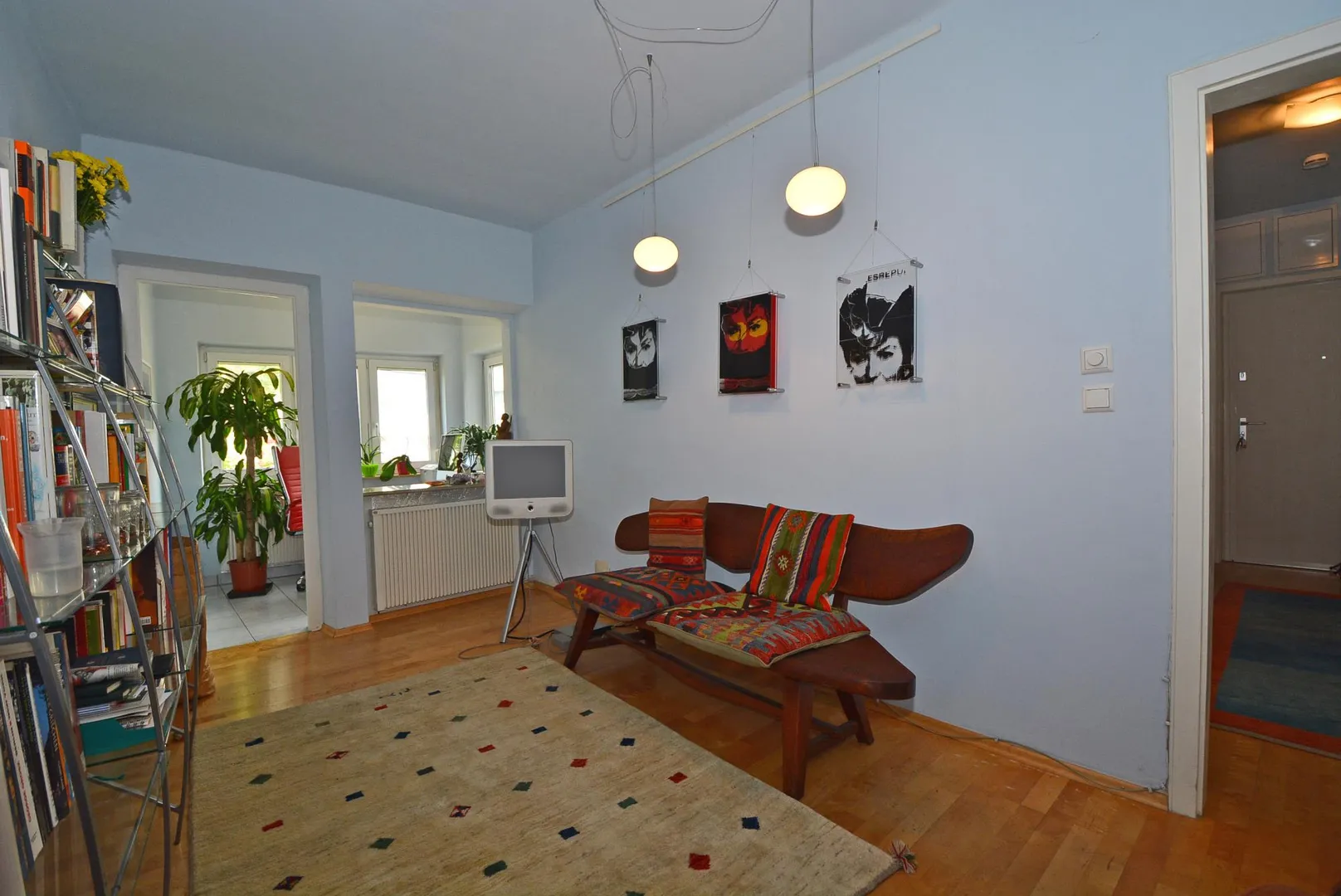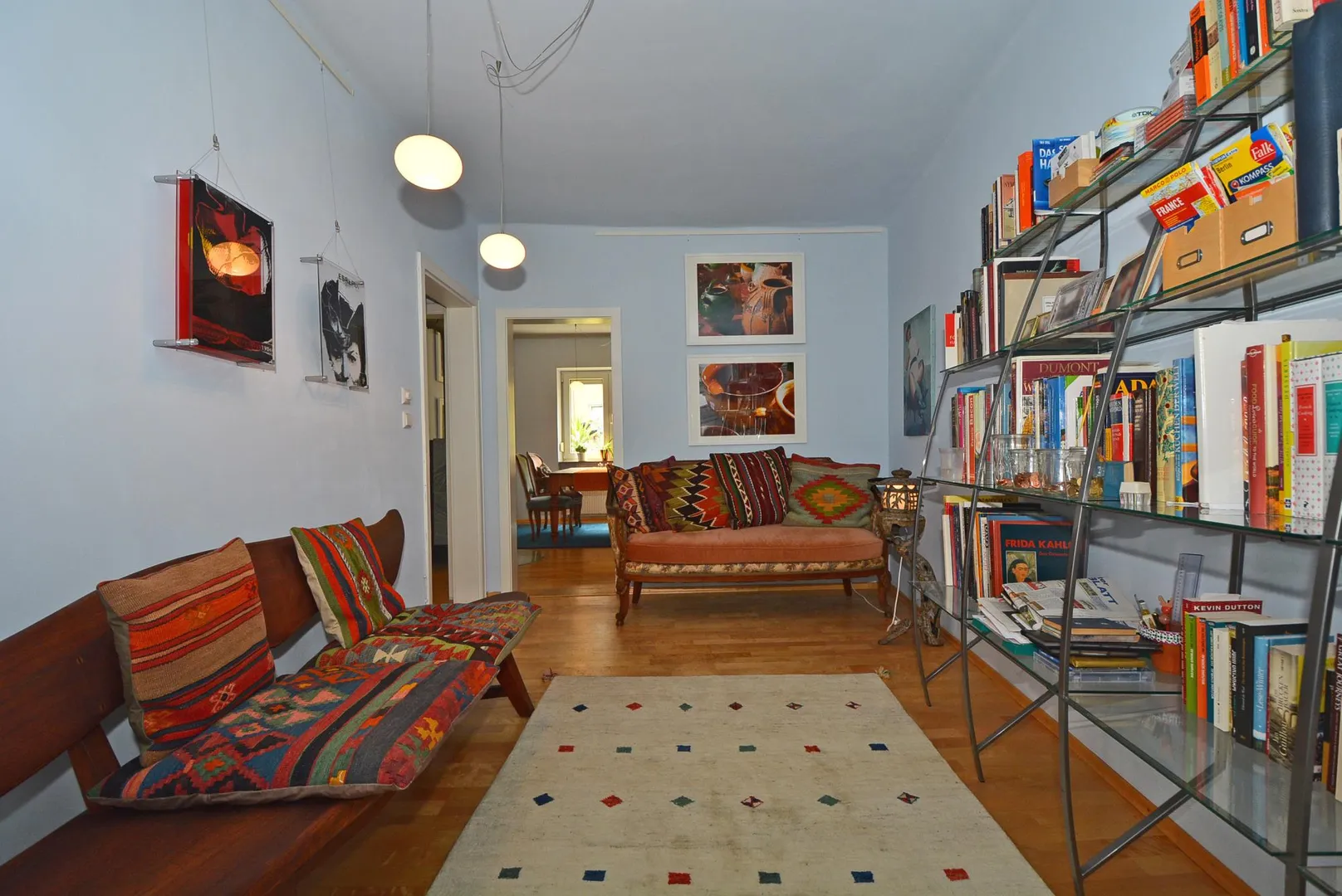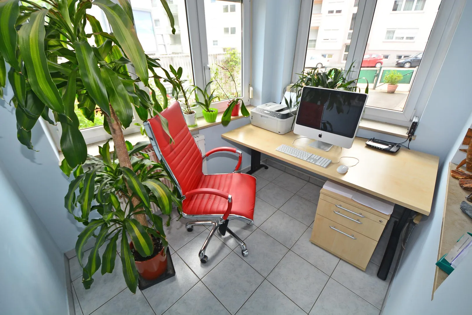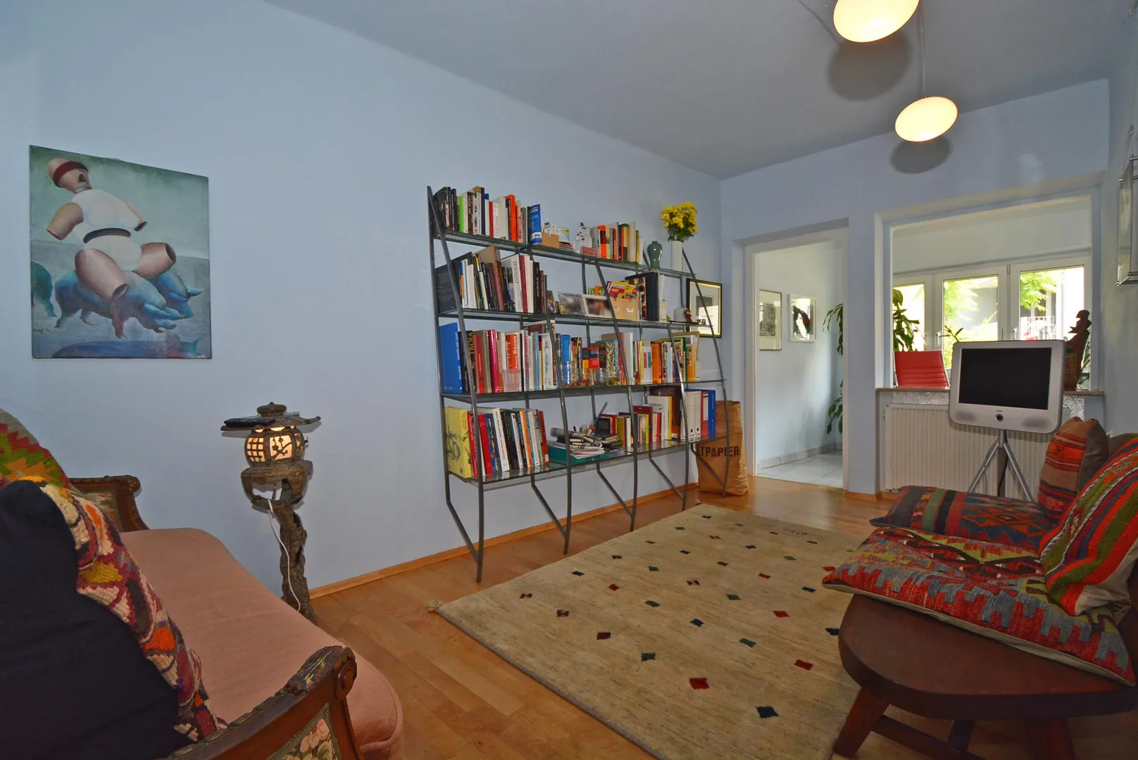 Der aktuell als Wohnzimmer genutzte Raum ist mit ca. 12 m² relativ kompakt. Direkt im Anschluss des Wohnbereichs wurde die ursprüngliche Veranda zu einer hellen Arbeitsecke umfunktioniert.