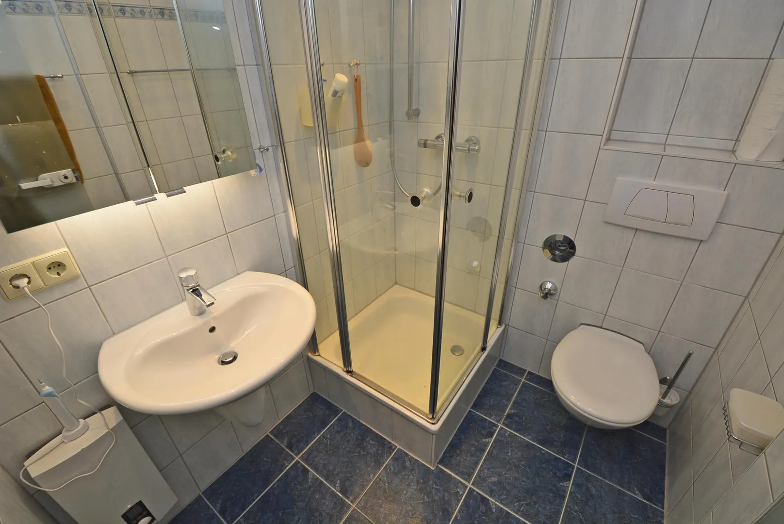 Das Bad ist innenliegend (ohne Fenster) und raumhoch gefliest. Es ist ausgestattet mit strukturiertem Fliesenboden, Dusche, Waschbecken, WC und Abluft.