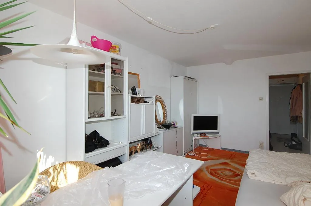 Die Wohnung ist mit Schlafcouch, Kleiderschrank, Vitrine und Kommode, Schreibtisch sowie TV-Regal mitsamt Fernseher ausgestattet.