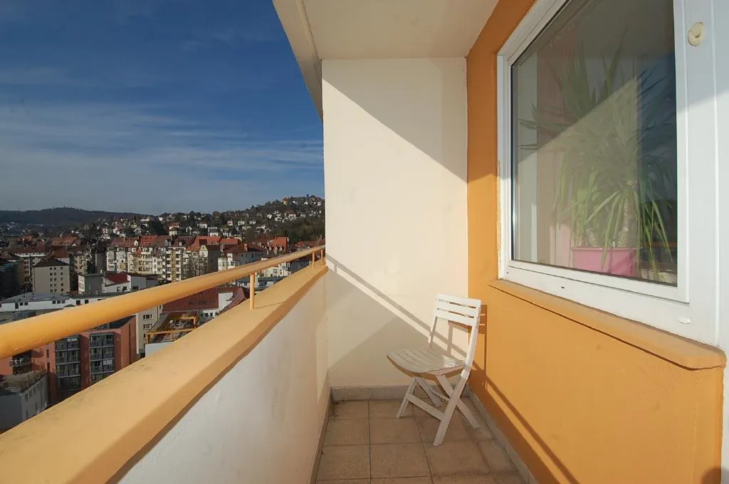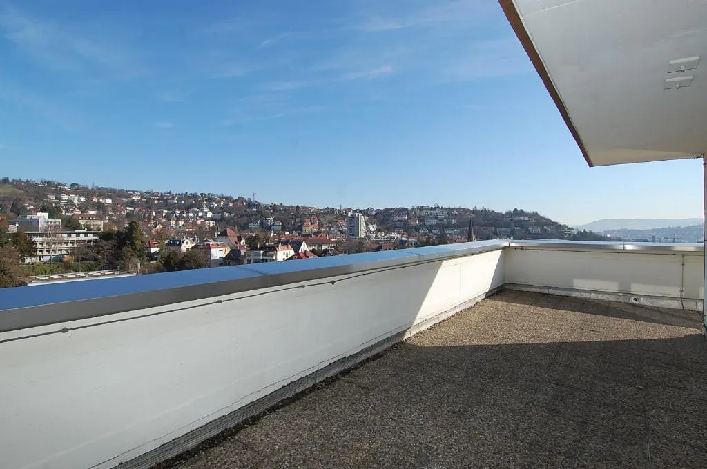 Vom Wohn- und Schlafzimmer gelangen Sie auf den sonnigen und überdachten Süd-Balkon mit einzigartiger und traumhafter Aussicht über Stuttgart-Mitte und Stuttgart-West bis hin zum Fernsehturm.