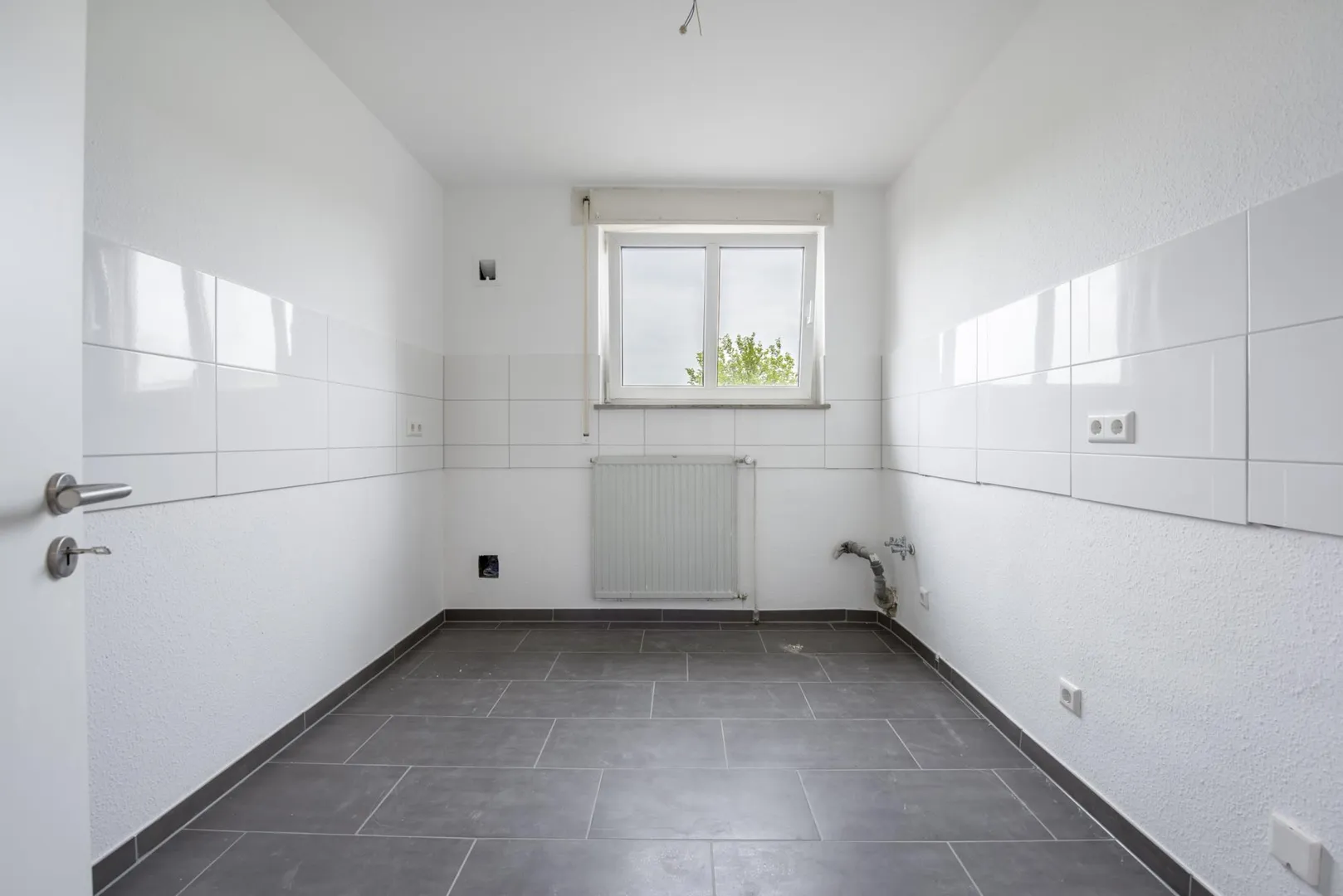 Die Küche ist ausgestattet mit einem Fliesenboden und einem Waschmaschinenanschluss. Es ist keine Einbauküche vorhanden.