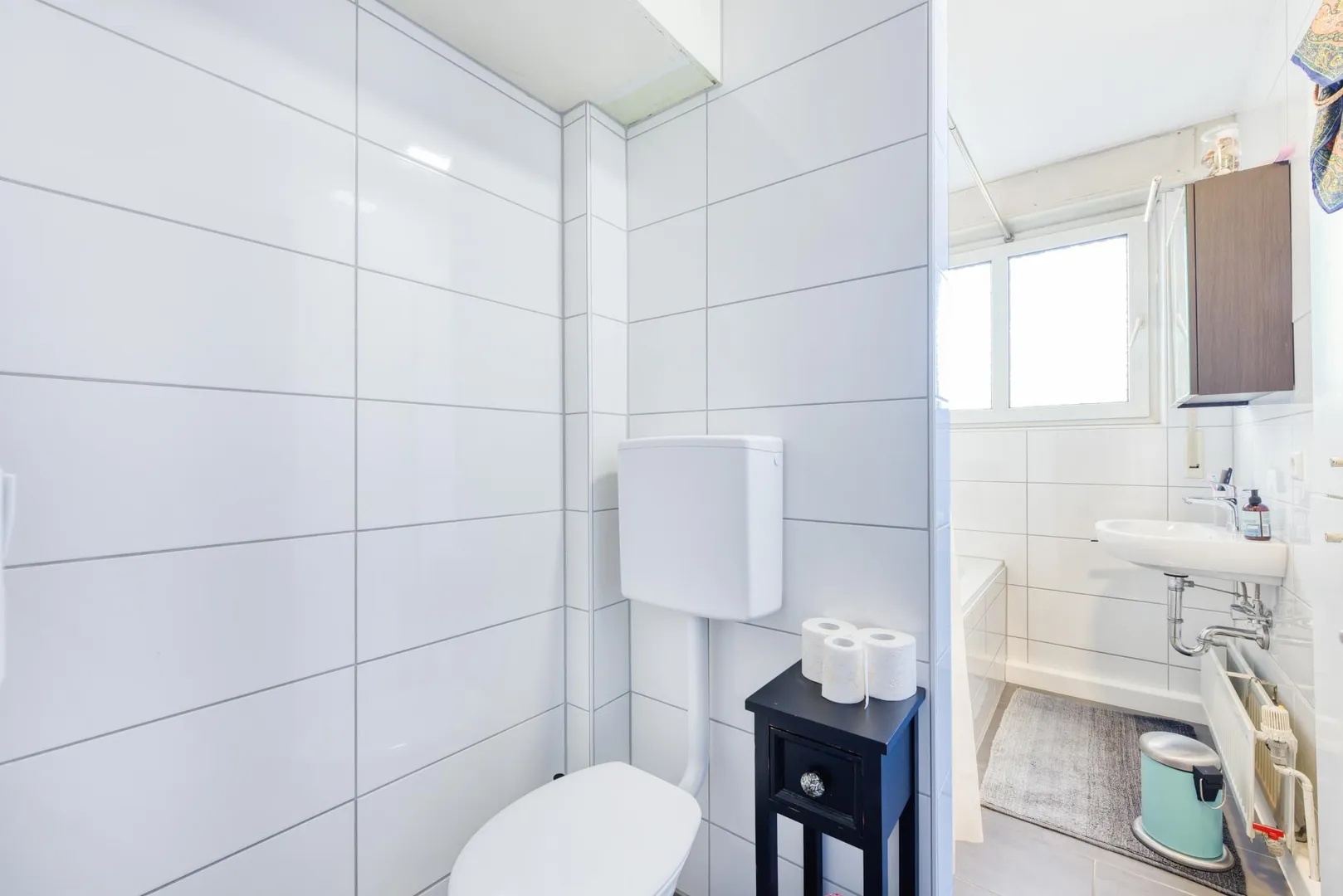 Das raumhoch geflieste Tageslicht-Badezimmer ist ausgestattet mit einem Fliesenboden, einer Badewanne, einem WC sowie einem Einbauschrank.
