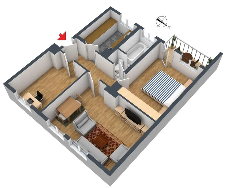 Das Wohnzimmer und das Arbeitszimmer sind nach Osten ausgerichtet. Die Küche, das Badezimmer sowie das Schlafzimmer mit Balkon sind nach Westen ausgerichtet.