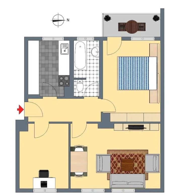 Der Grundriss ist gut. Alle Räume sind direkt vom Flur begehbar. Das Badezimmer verfügt über ein Fenster. Der ca. 4m² große und überdachte Balkon ist über das Schlafzimmer begehbar.