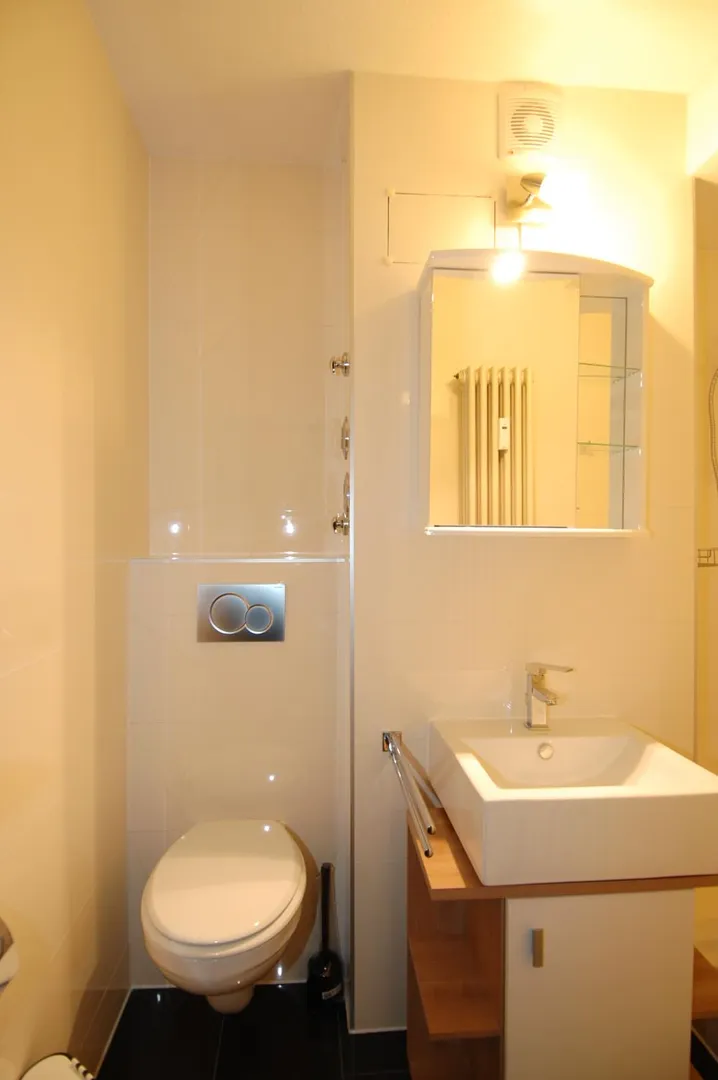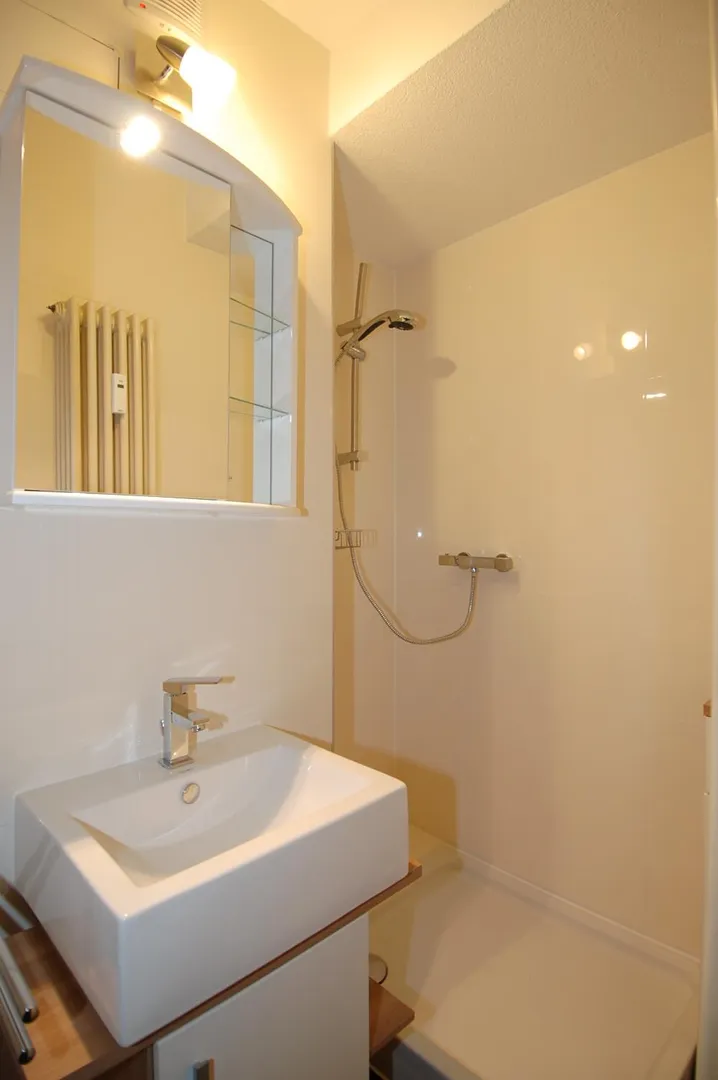 Das modernisierte Bad ist raumhoch gefliest und mit anthrazitfarbenem Fliesenboden, Dusche, Waschtisch, WC und Handtuchhalter-Heizkörper ausgestattet.