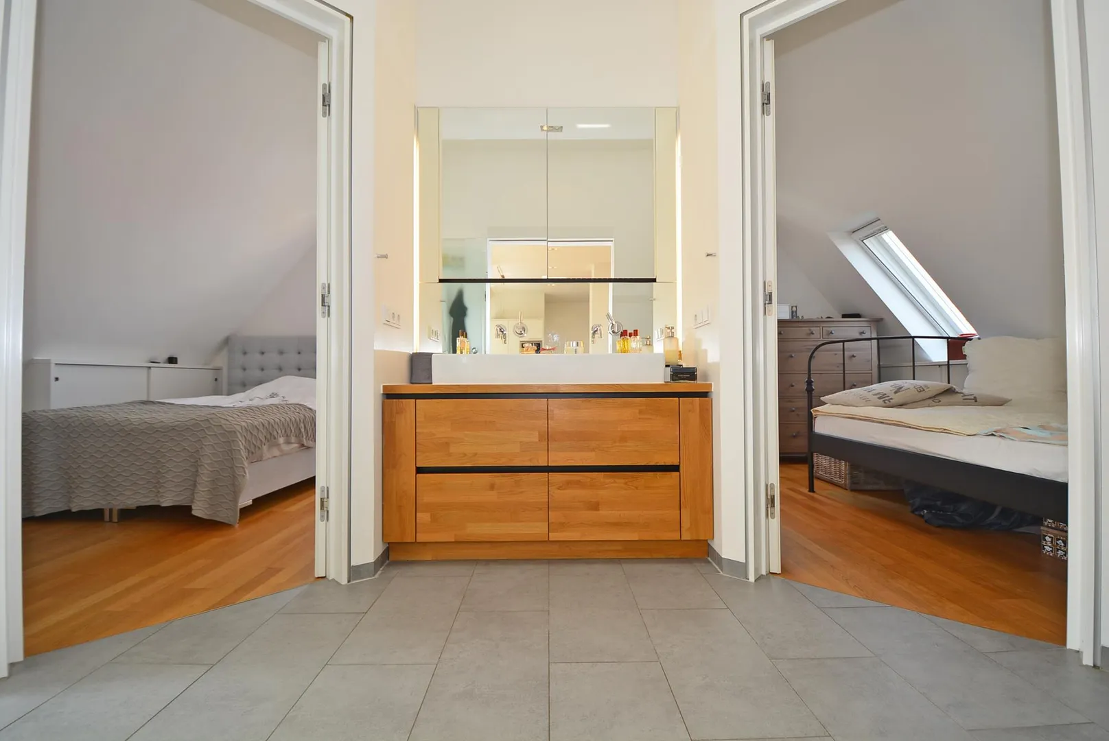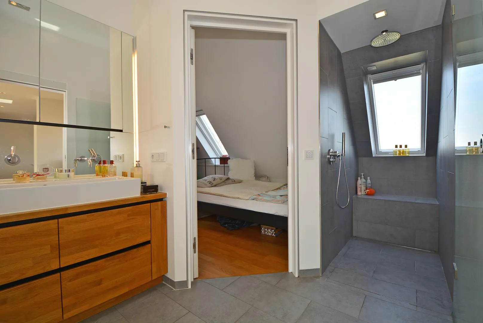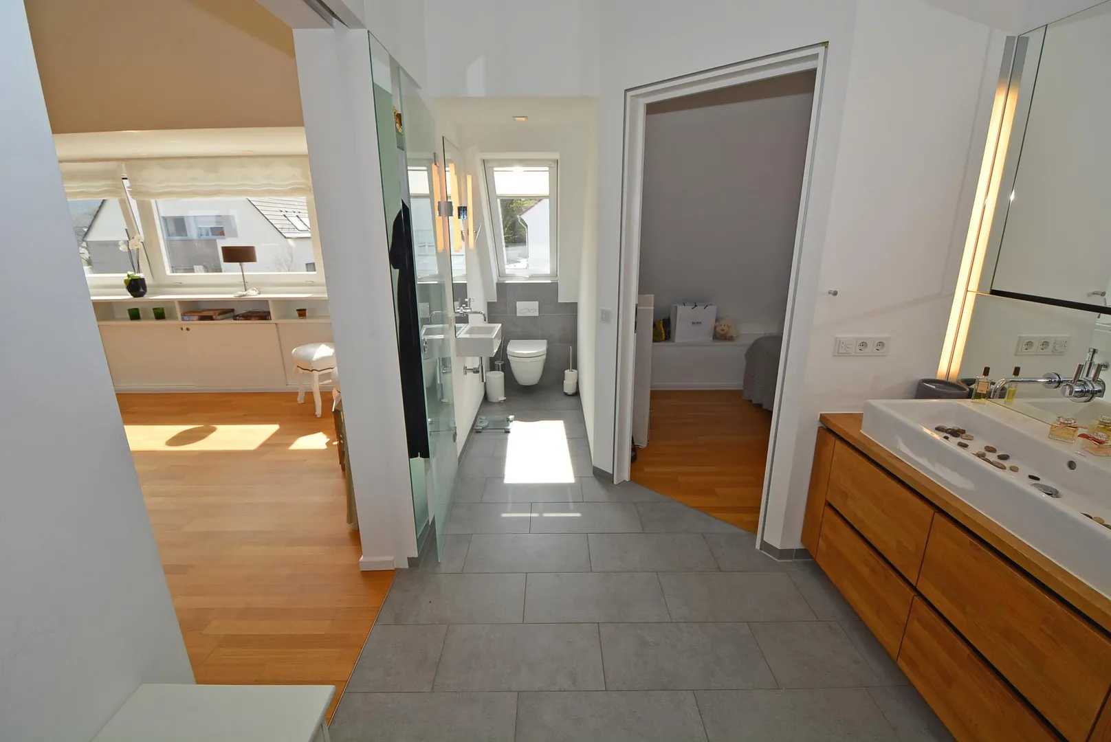 Das Bad ist auch Vorraum zu den zwei weiteren Zimmern und ist mit grauem Feinstein gefliest.