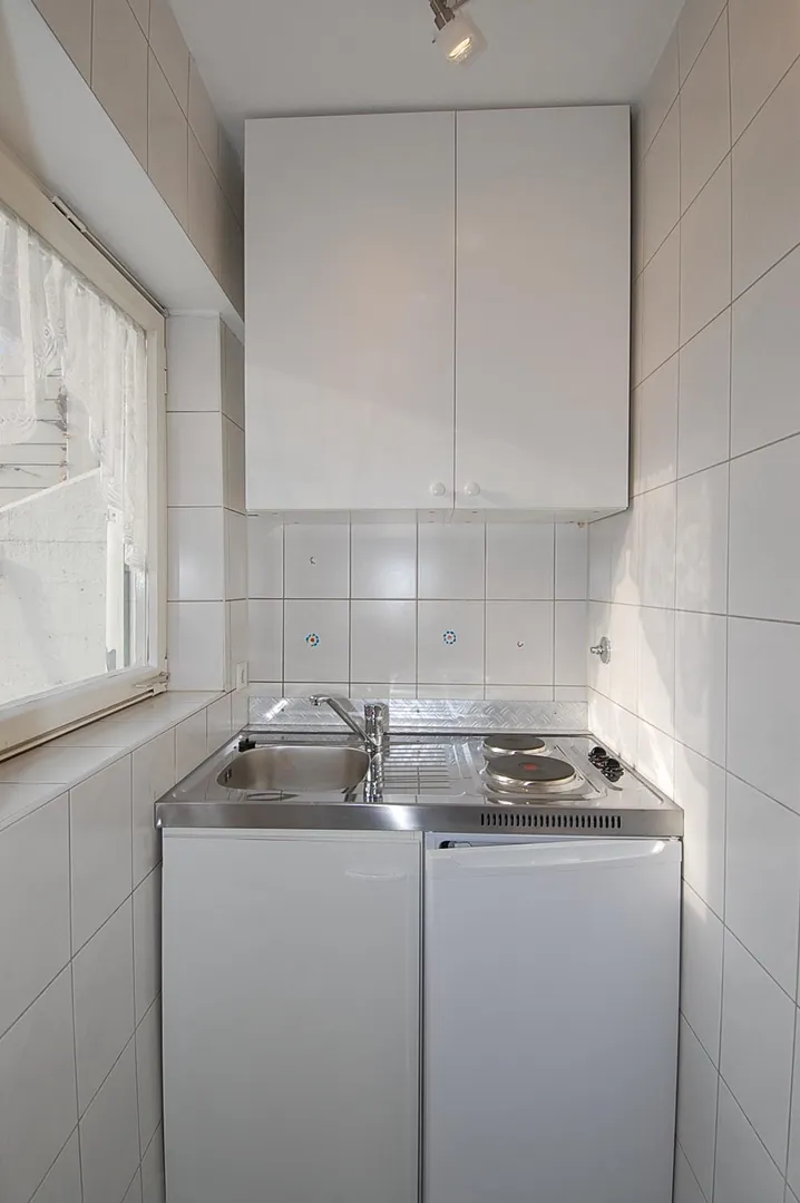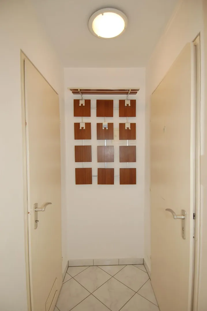 Das praktische und kompakte Apartment ist mit hellem Fliesenboden und weiß gestrichenen Raufasertapeten ausgestattet.