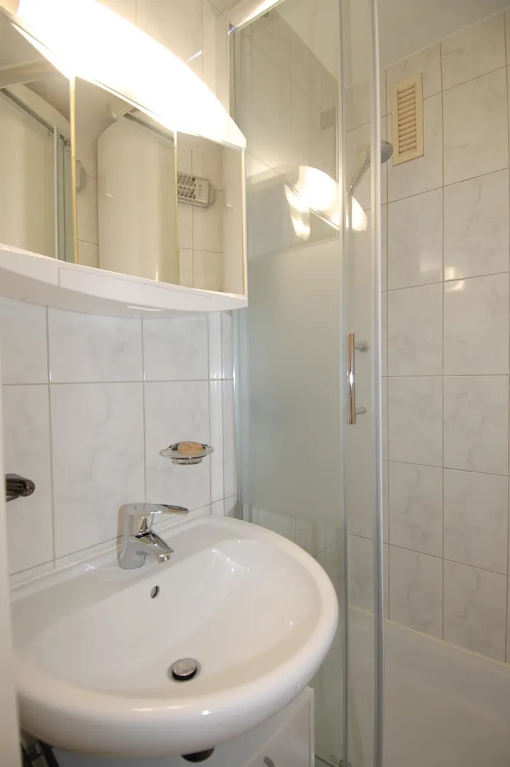 Das Bad ist raumhoch und hell gefliest und ausgestattet mit Dusche, Waschbecken, Spiegelschrank, WC, Elektro-Heizer und Elektro-Boiler.