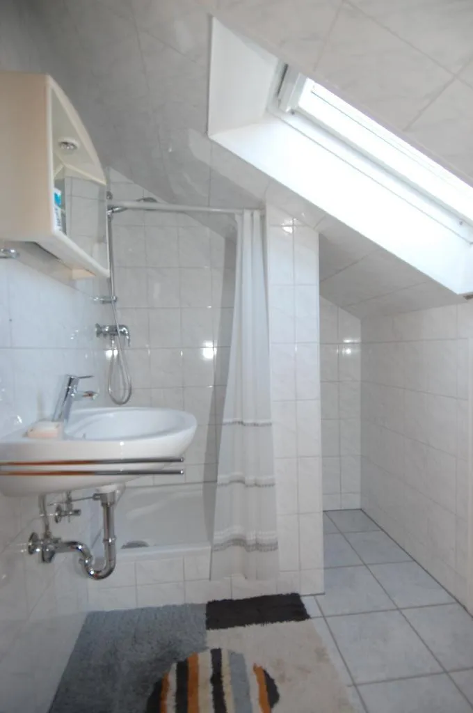 Das Badezimmer wurde 2007 komplett modernisiert. Es ist raumhoch gefliest und mit einem Fenster, einer Dusche, einem WC und einem Fliesenboden ausgestattet.