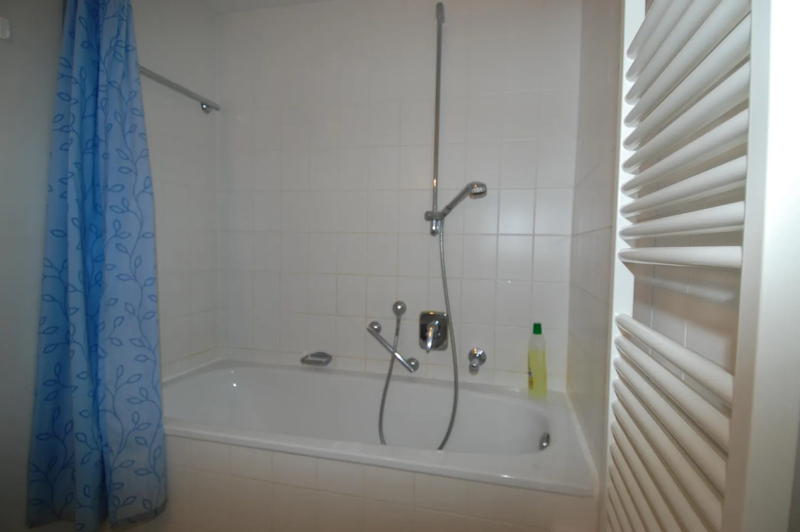 Das Badezimmer ist raumhoch weiß gefliest und verfügt über eine Badewanne mit Duschmöglichkeit und ein WC. In der Wohnung befindet sich ein Abstellraum. Zur Wohnung gehört auch ein weiterer Abstellraum im Untergeschoss.