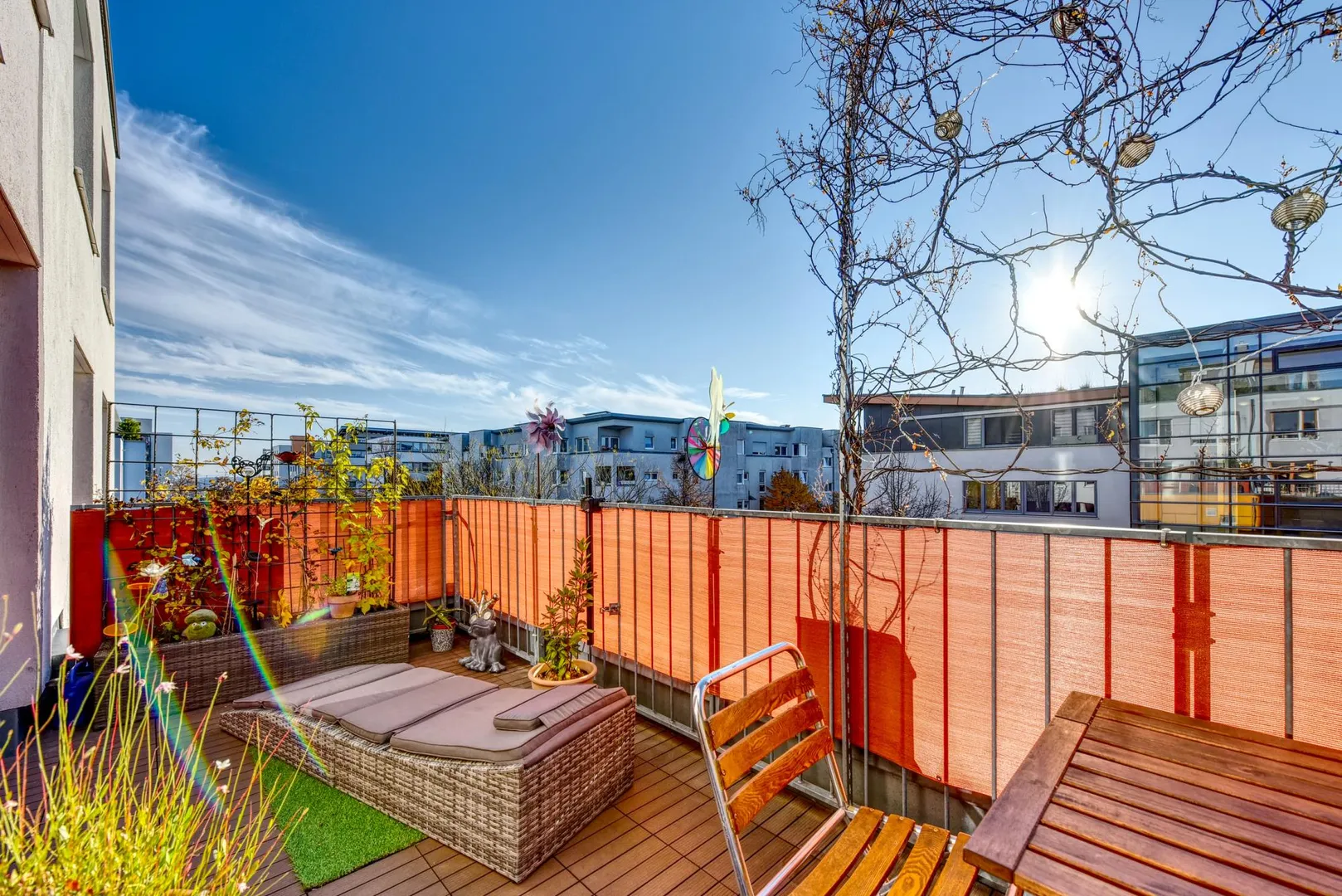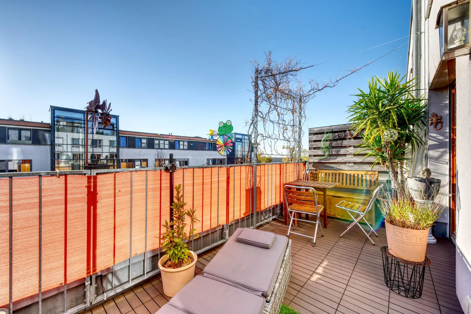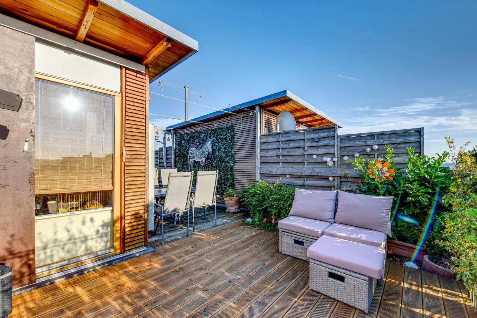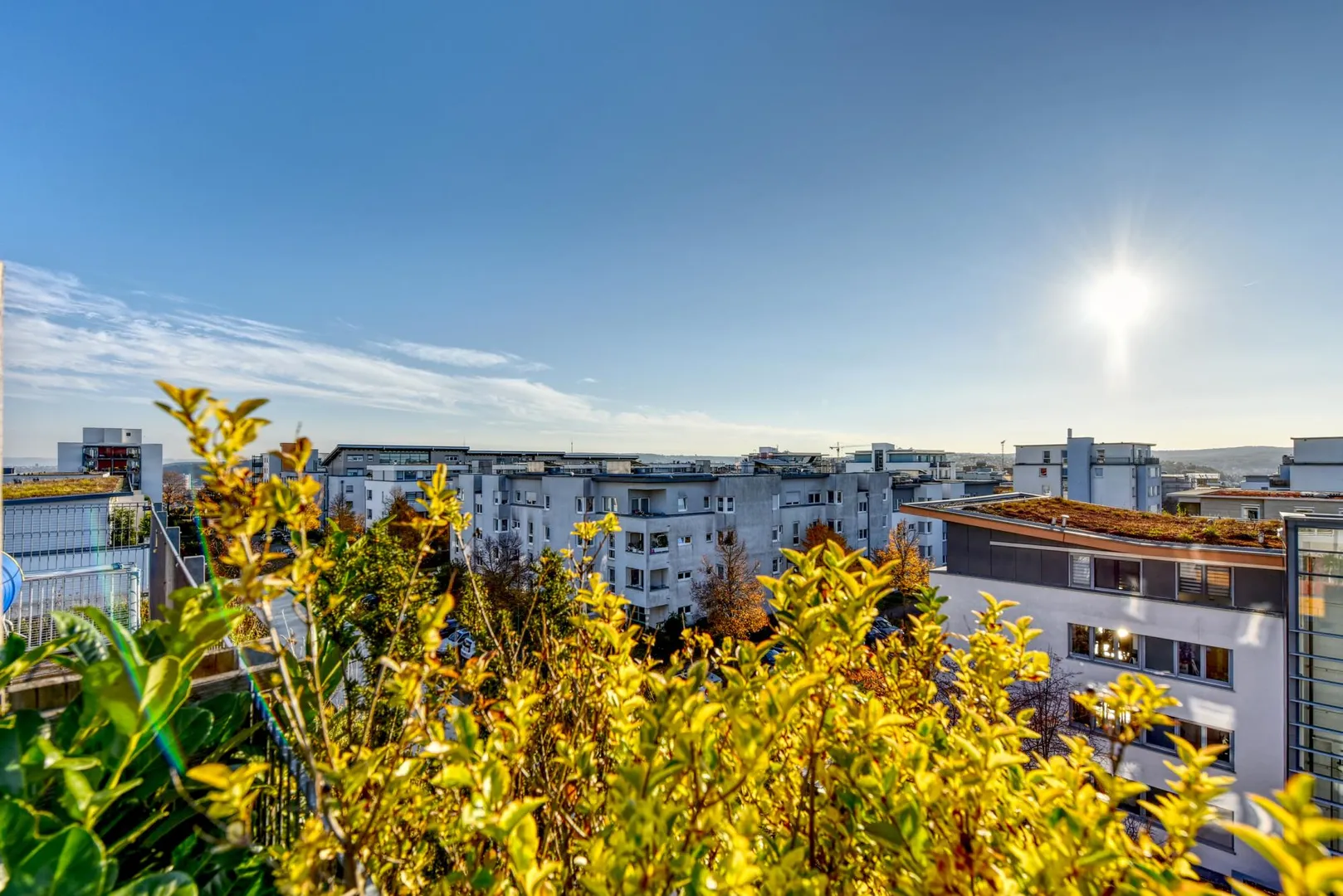 Auf dem Dach befindet sich die knapp 40 m² große Dach-Terrasse mit Fernblick. Hier können Sie sowohl den Sonnenaufgang, die Mittagssonne als auch den Sonnenuntergang zelebrieren.