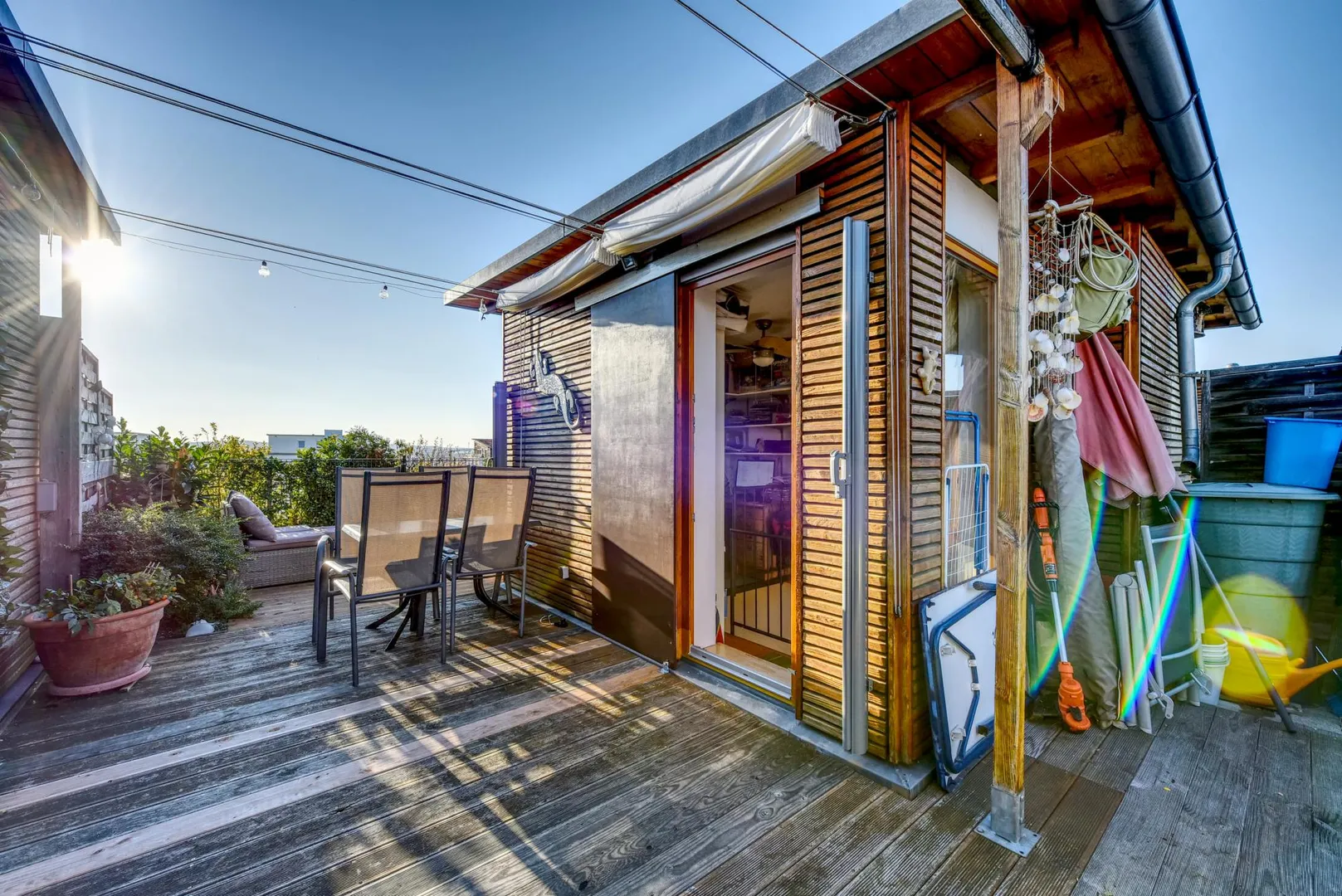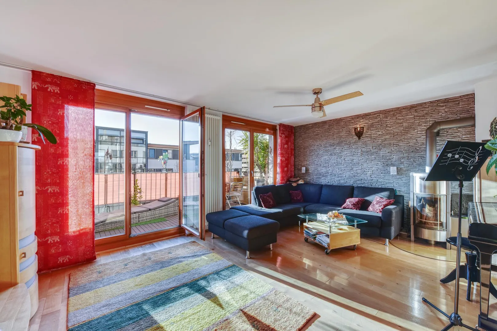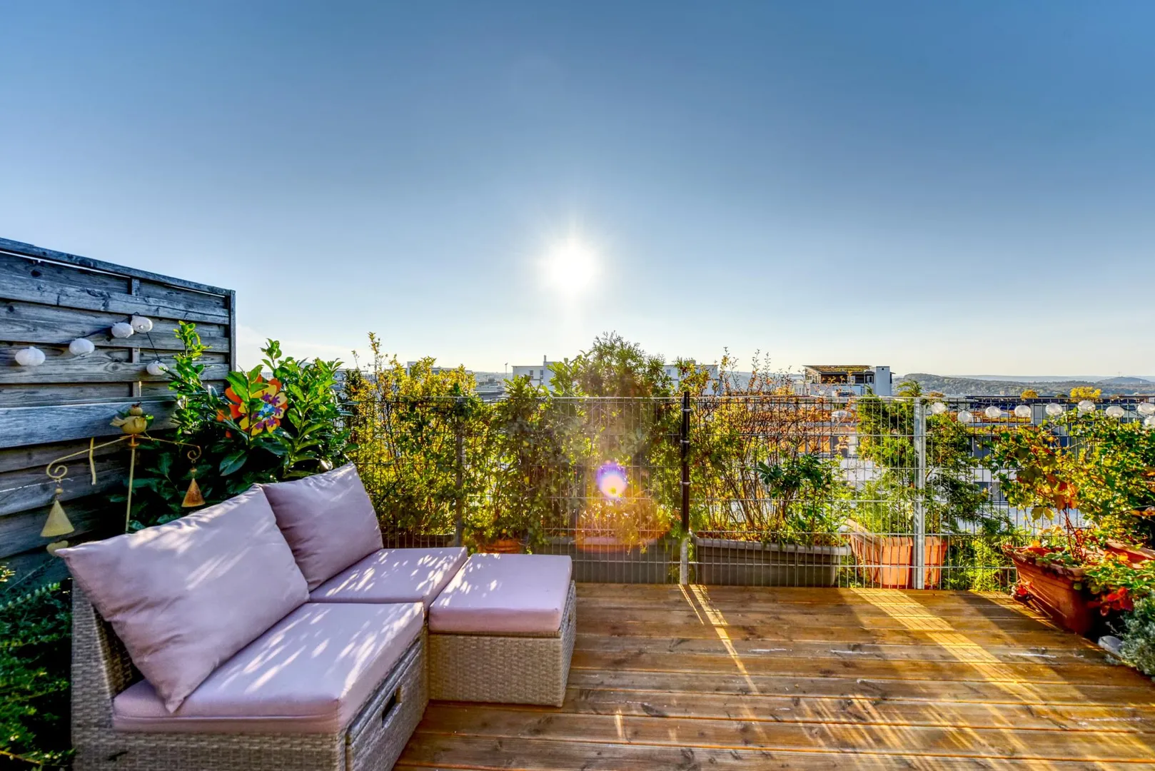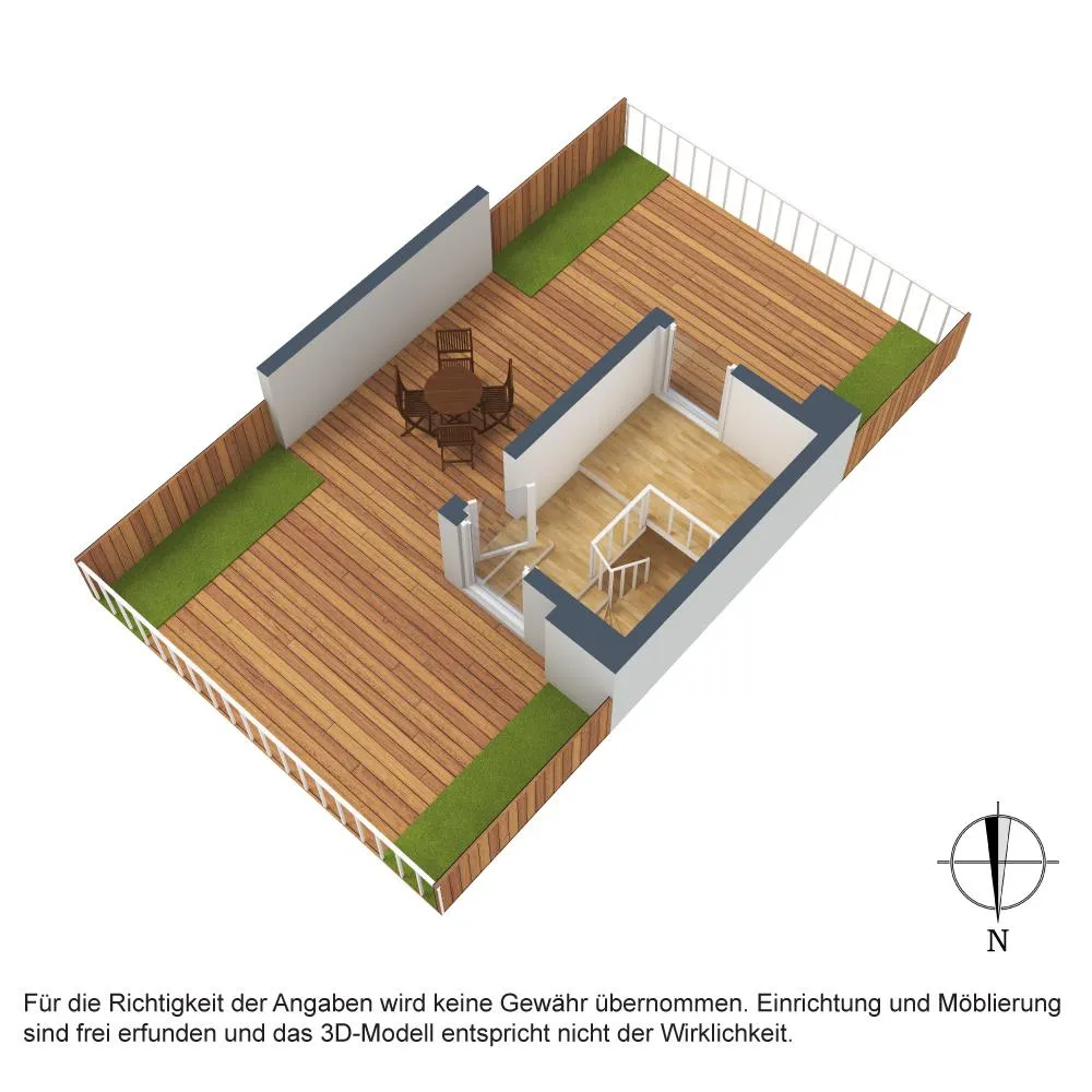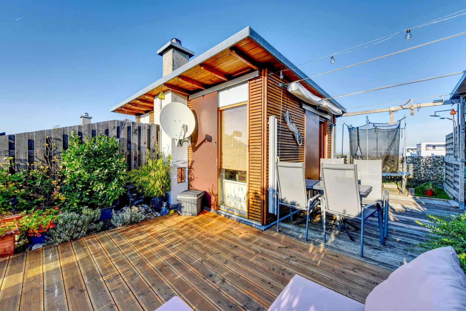 Auf dem Dach befindet sich die knapp 40 m² große Dach-Terrasse mit Fernblick. Hier können Sie sowohl den Sonnenaufgang, die Mittagssonne als auch den Sonnenuntergang zelebrieren.