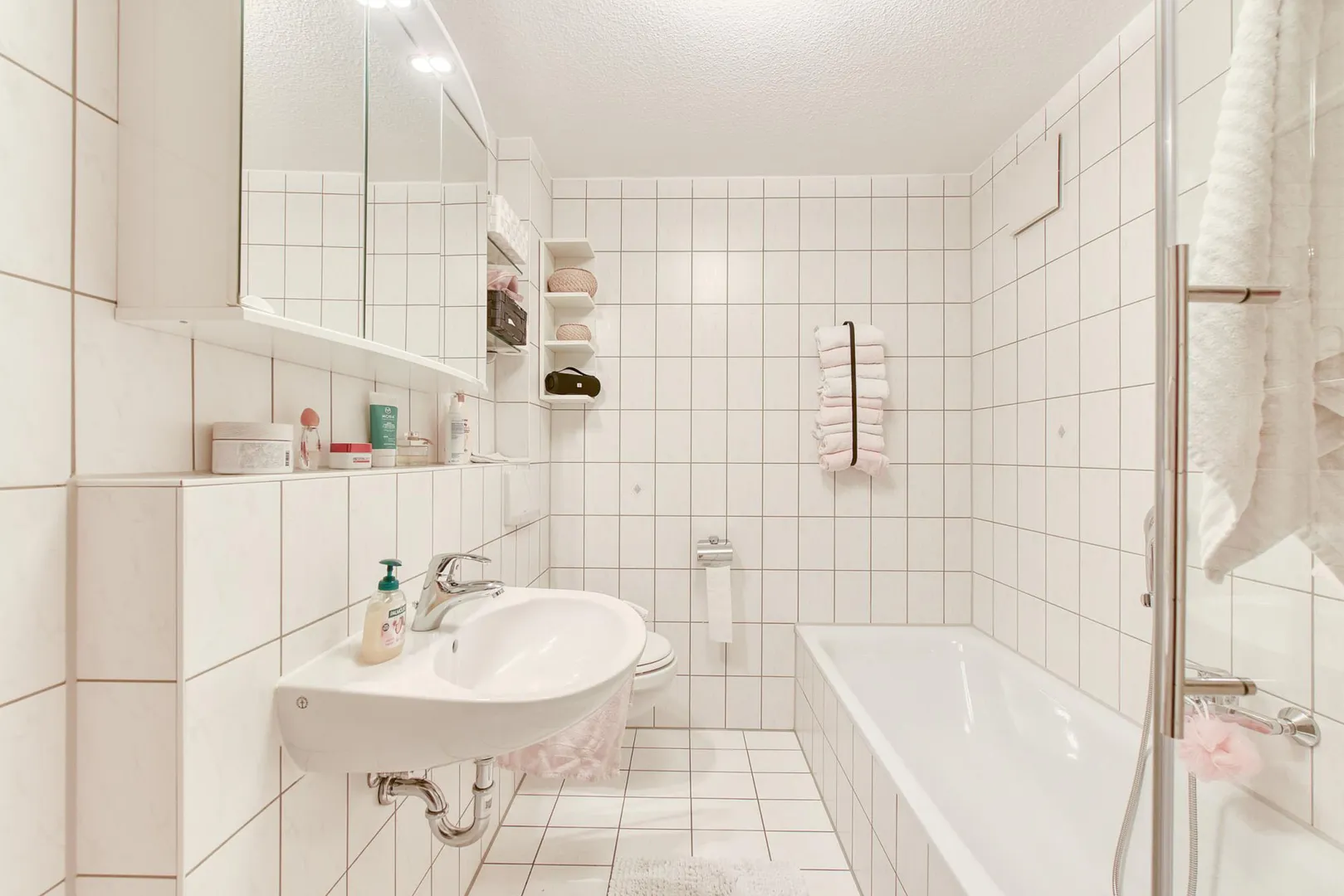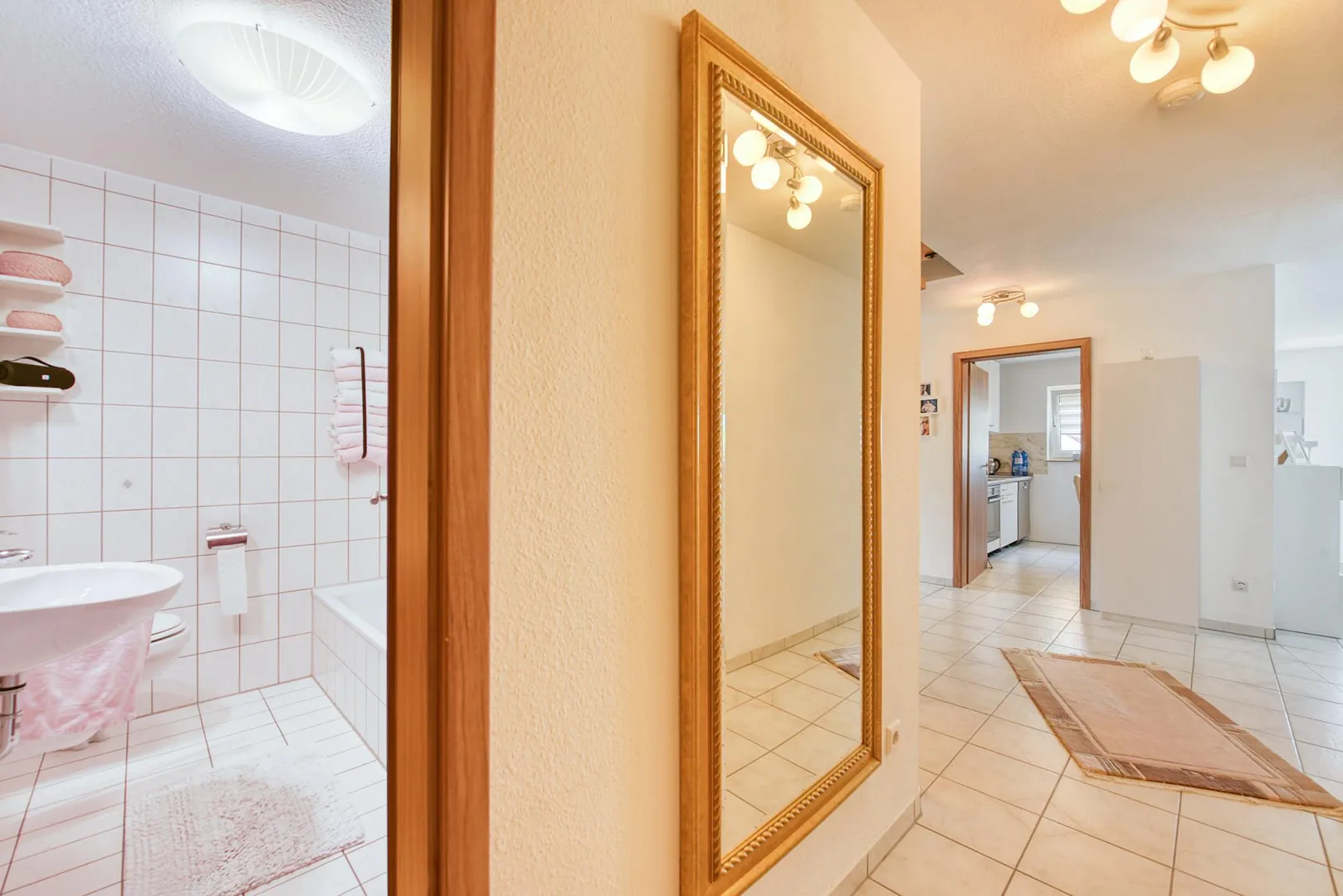 Das raumhoch geflieste Badezimmer ist ausgestattet mit einer Badewanne, einer Dusche sowie einen Spiegelschrank.