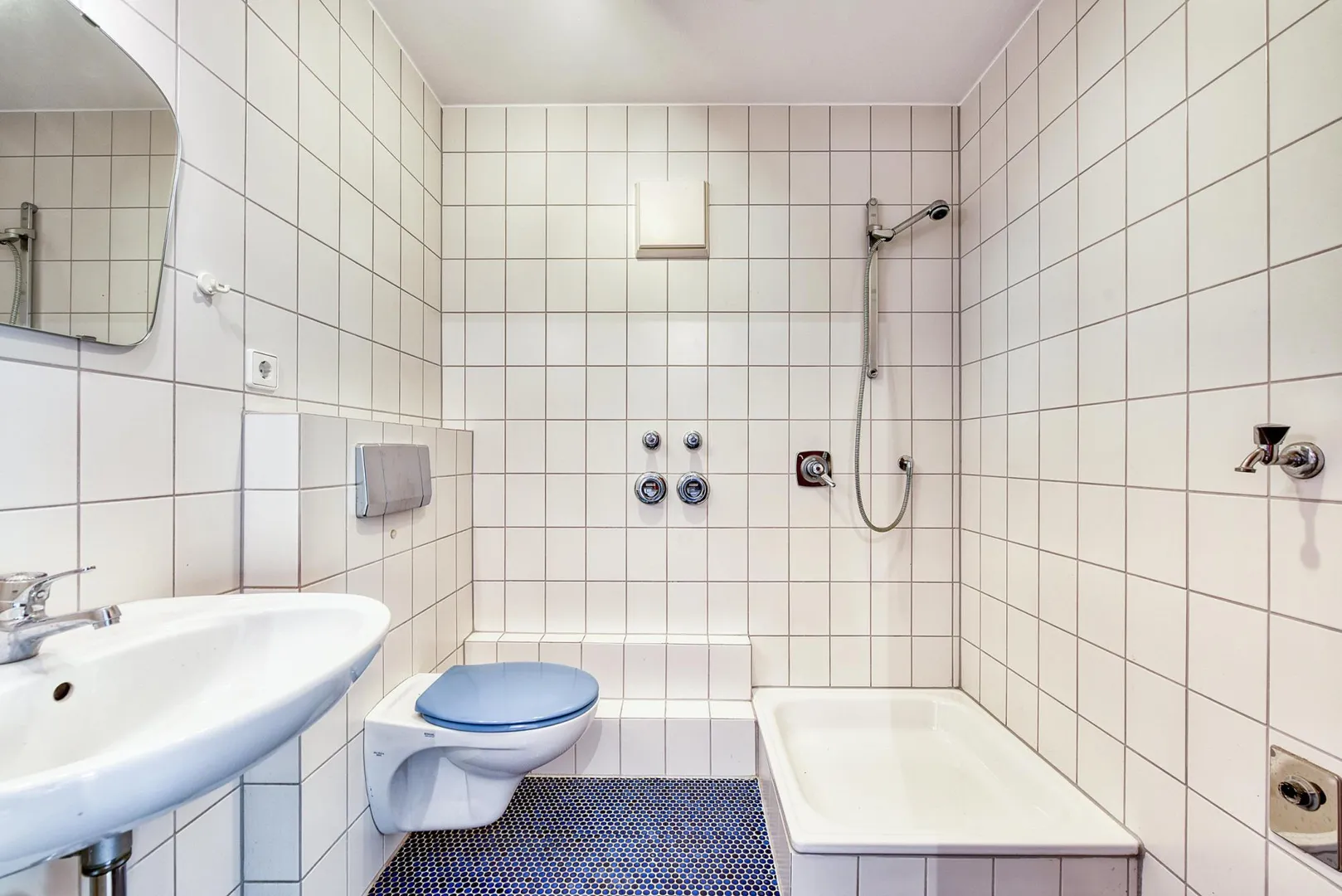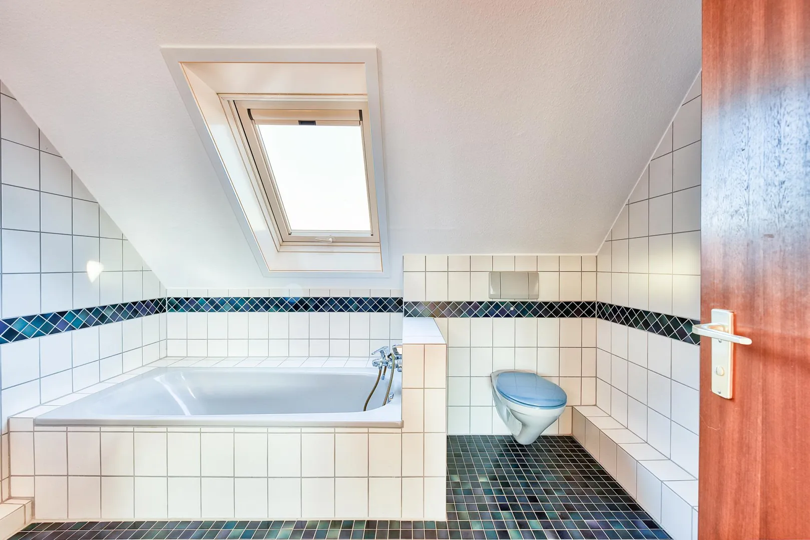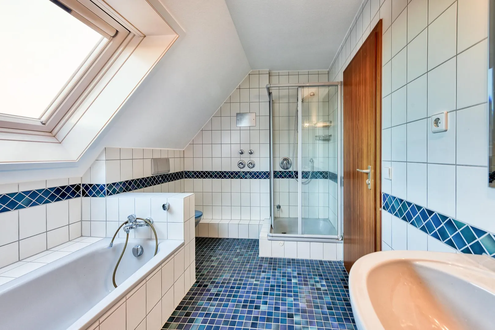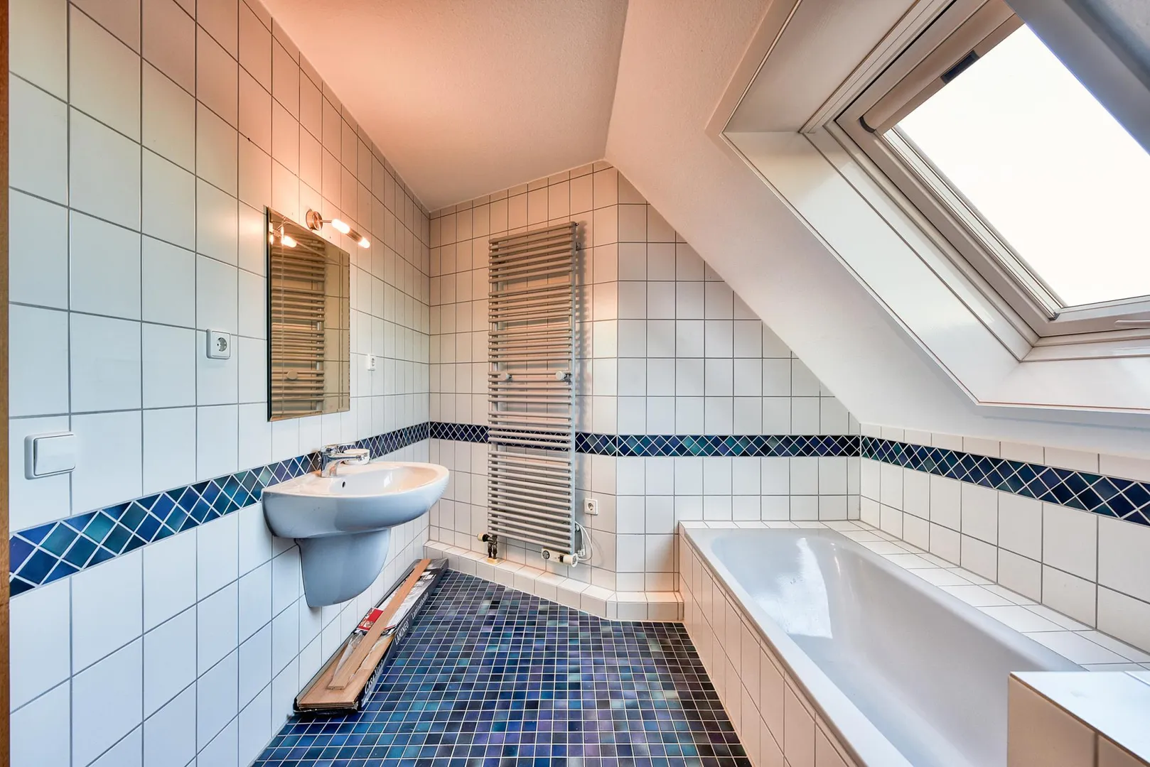 Im Studio-Geschoss befindet sich das zweite Badezimmer mit Fenster. Es ist raumhoch gefliest und ist ausgestattet mit einem Mosaik-Fliesenboden, einer Badewanne, einer Dusche, einem WC sowie einem Handtuch-Heizkörper.