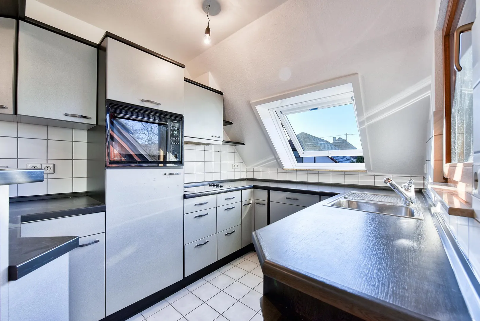 Die Küche ist offen und ist ausgestattet mit einem Fliesenboden sowie einer älteren Einbauküche.