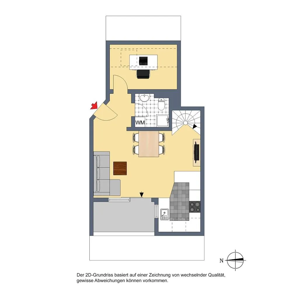 Der Grundriss ist offen gestaltet. Der Eingangs-/Ess-/Wohnbereich, die Küche sowie das Studio sind offen. Ein abschließbares Zimmer ist das Arbeitszimmer.