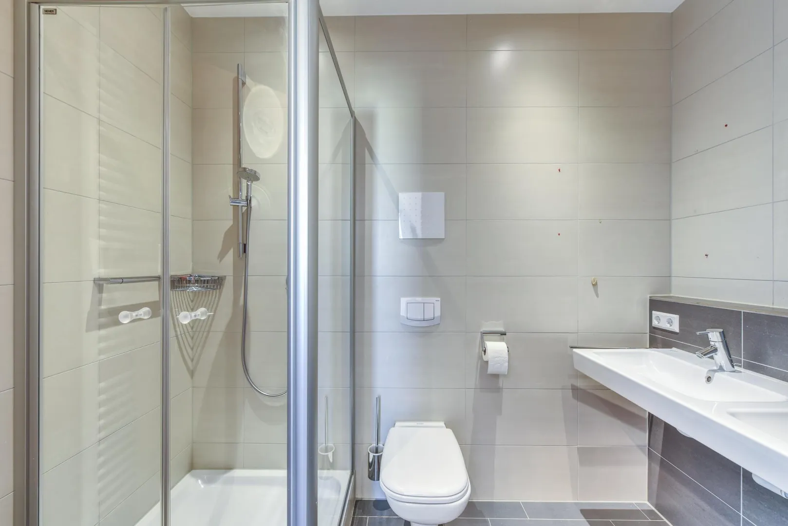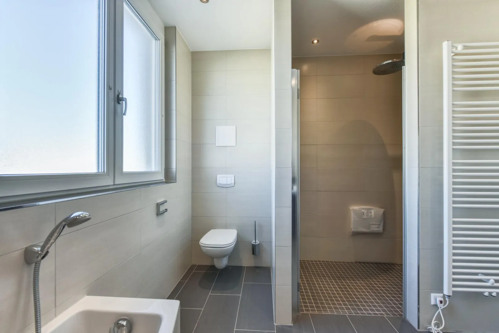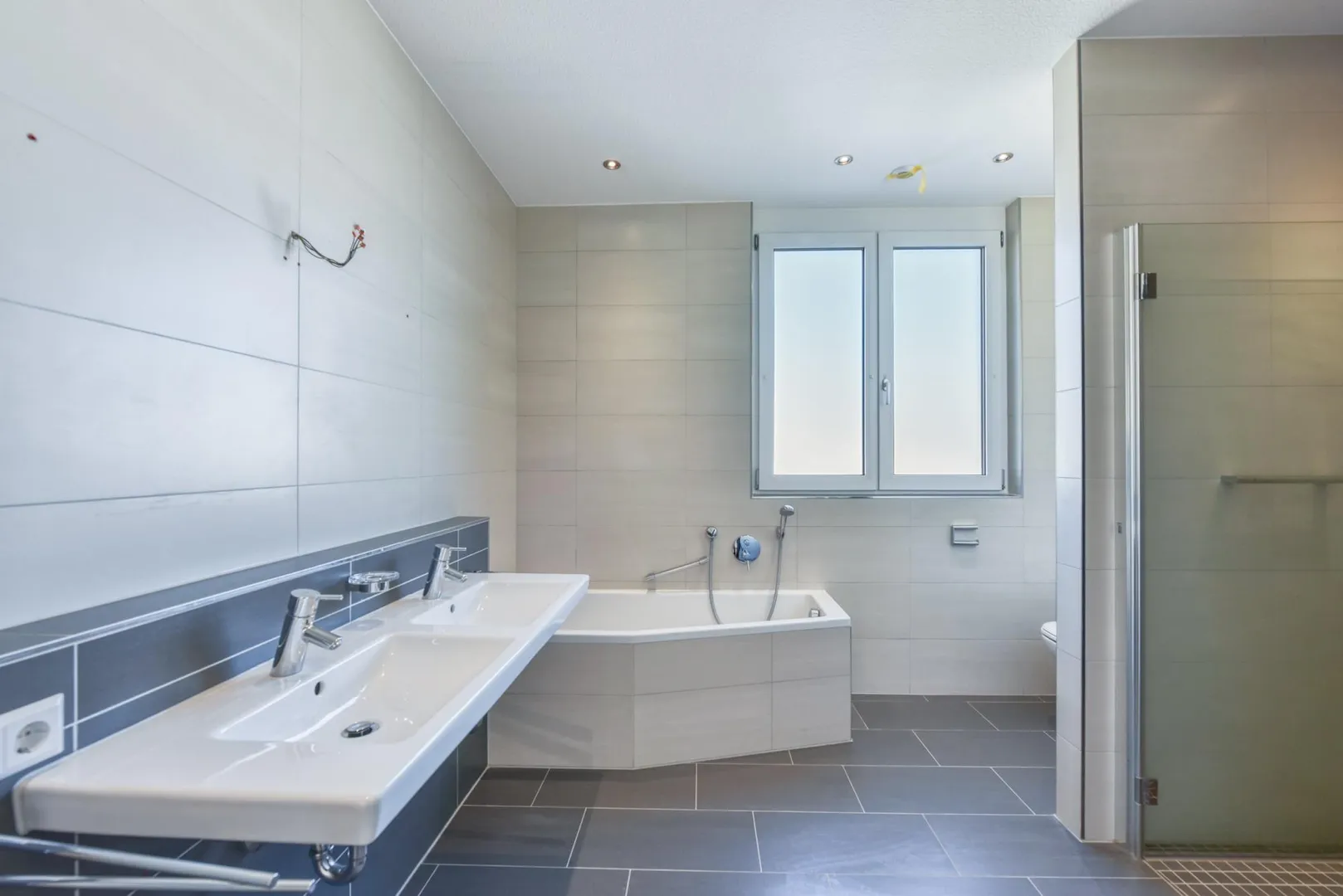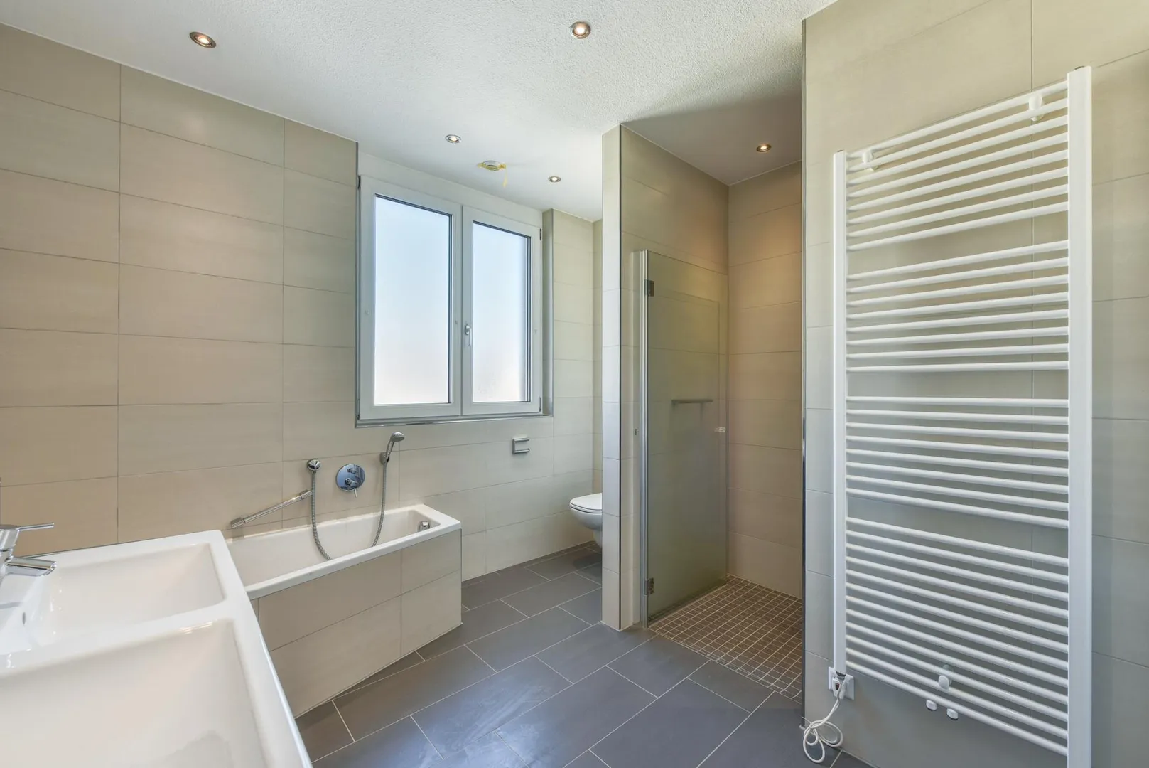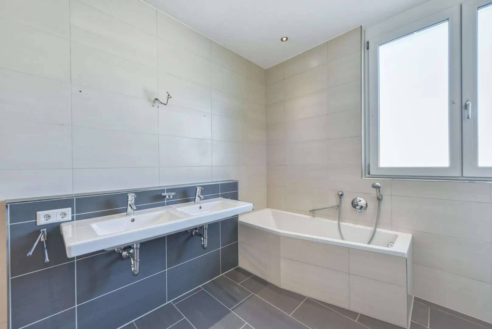 Beide Bäden sind raumhoch gefliest, verfügen zusätzlich über einen Handtuch-Heizkörper und sind ausgestattet mit Doppel-Waschbecken. Im Januar werden die Badmöbeln geliefert.