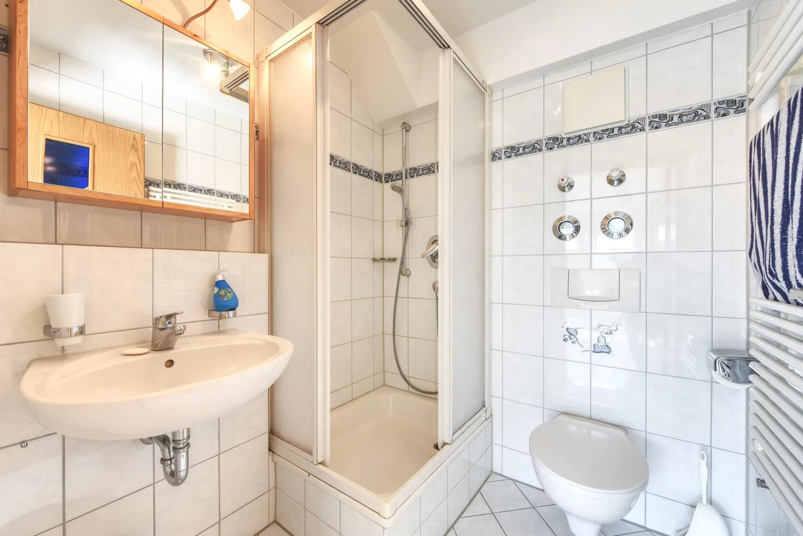 Das raumhoch geflieste Badezimmer ist ausgestattet mit einer Dusche, einem Handtuch-Heizkörper sowie einem Spiegelschrank.