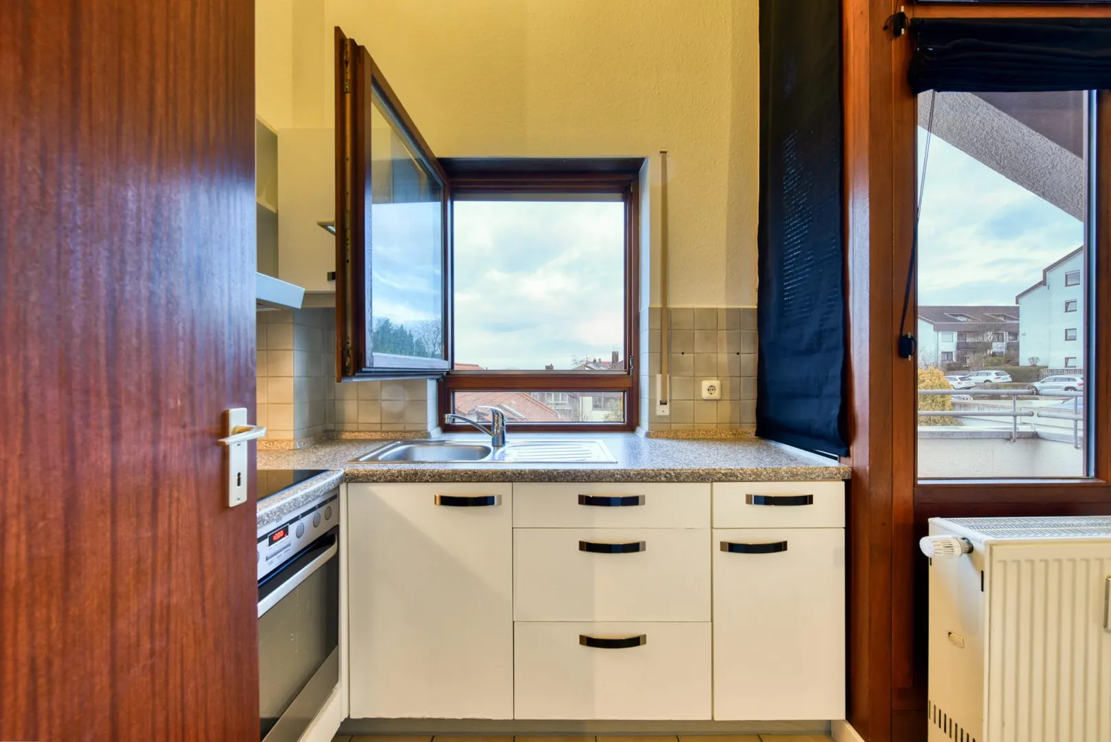 Diese gemütliche und frisch renovierte 1-Zimmer-Dachgeschoss-Wohnung mit Balkon und Fernblick befindet sich im 2. Obergeschoss eines 15-Familien-Reihen-Eck-Hauses.