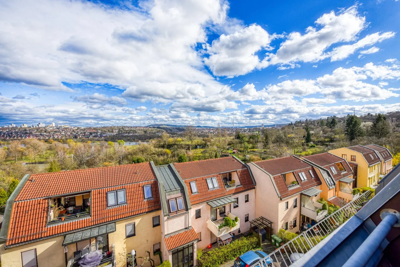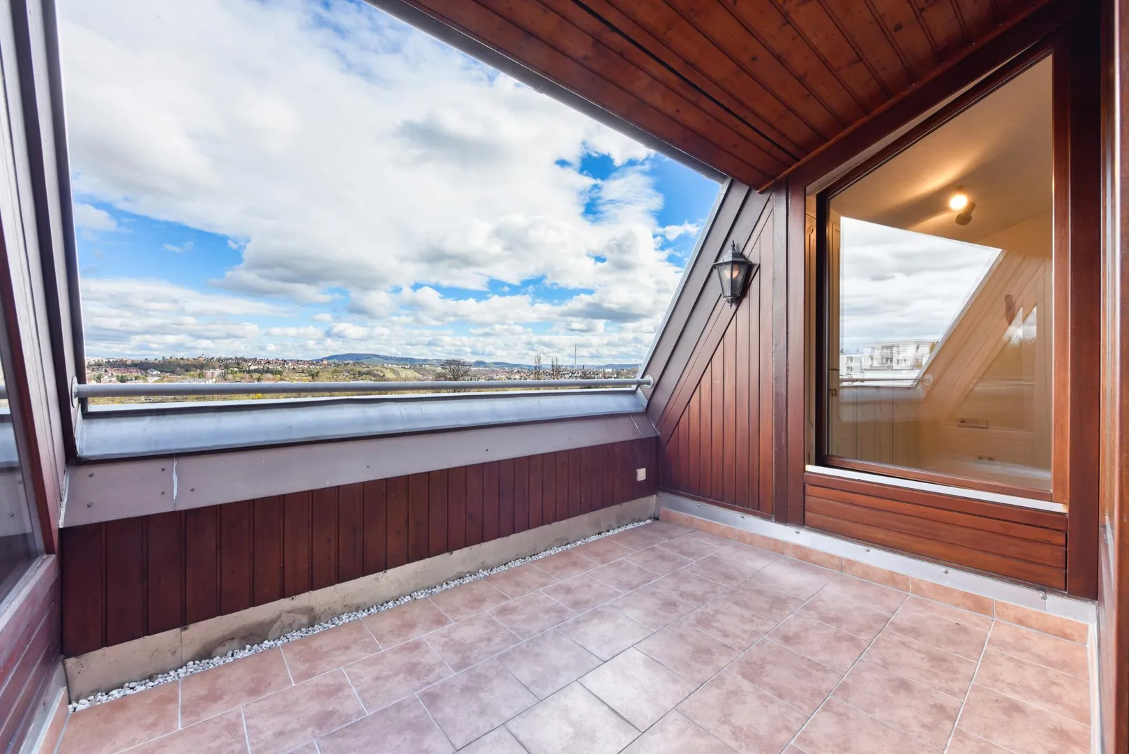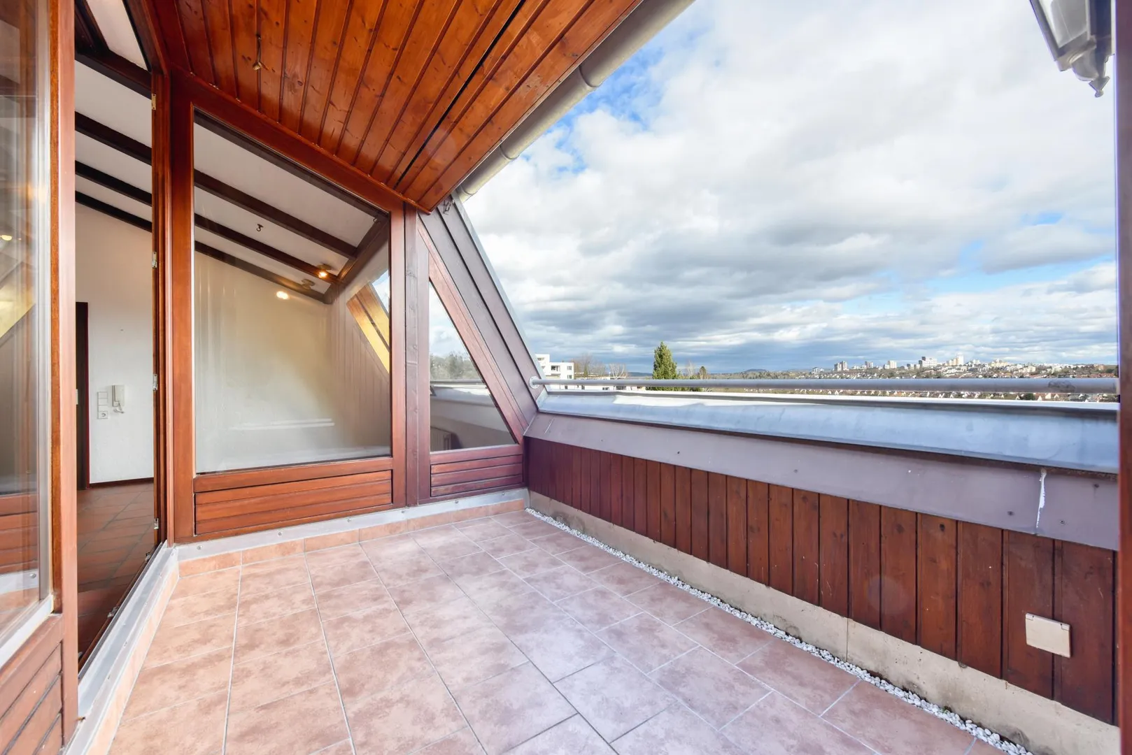 Die Wohnung verfügt über einen schönen, ca. 6 m² großen und teilüberdachten Dach-Einschnitt, welcher nach Ost-Süd ausgerichtet ist. Von hier aus haben Sie eine wundervolle Fernsicht über den Max-Eyth-See, zum Kappelberg und ins Grüne.