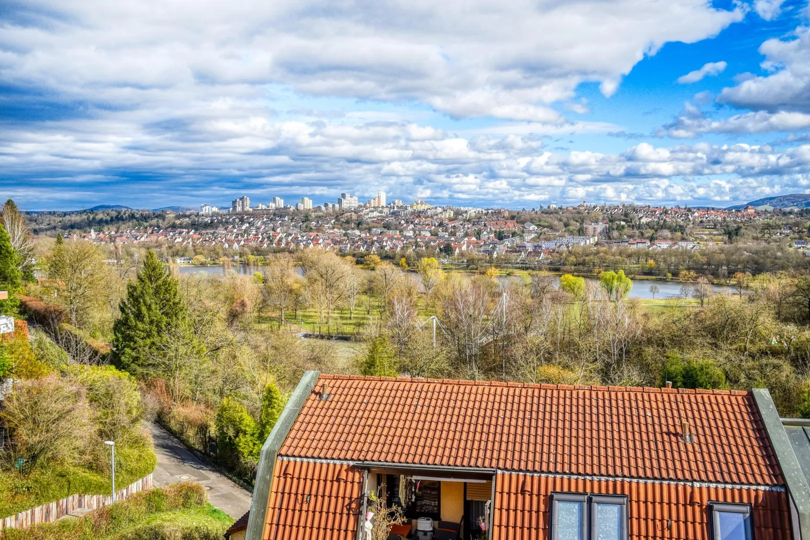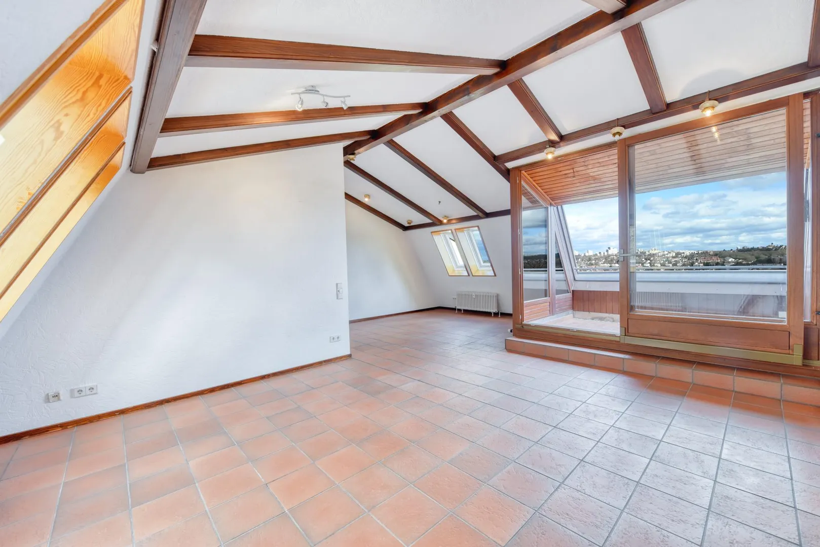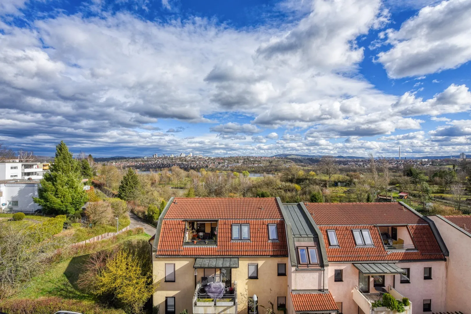 Die Wohnung verfügt über einen schönen, ca. 6 m² großen und teilüberdachten Dach-Einschnitt, welcher nach Ost-Süd ausgerichtet ist. Von hier aus haben Sie eine wundervolle Fernsicht über den Max-Eyth-See, zum Kappelberg und ins Grüne.