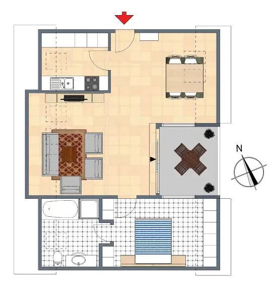 Der Wohnbereich ist offen gestaltet. Wegen des Grundrisses eignet sich die Wohnung lediglich für einen Single. Das Schlafzimmer ist über das Wohnzimmer begehbar und das Badezimmer ist über das Schlafzimmer begehbar.