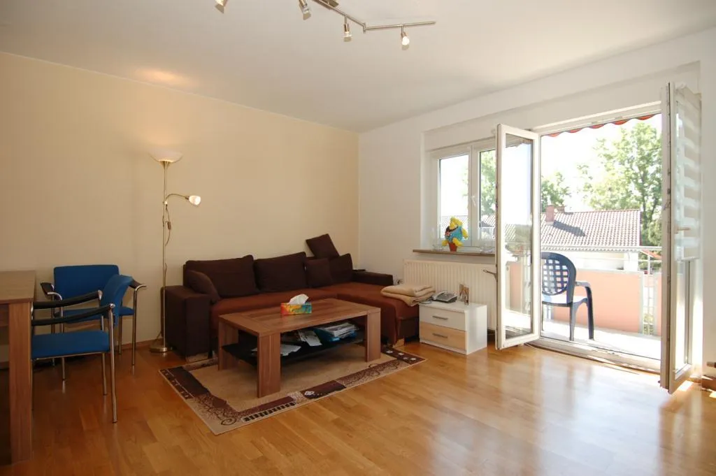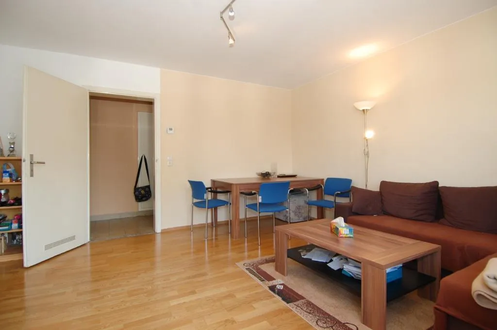 Das Wohnzimmer ist mit einem Parkettboden ausgestattet. Vom Wohnzimmer ist der Balkon und das Schlafzimmer begehbar.