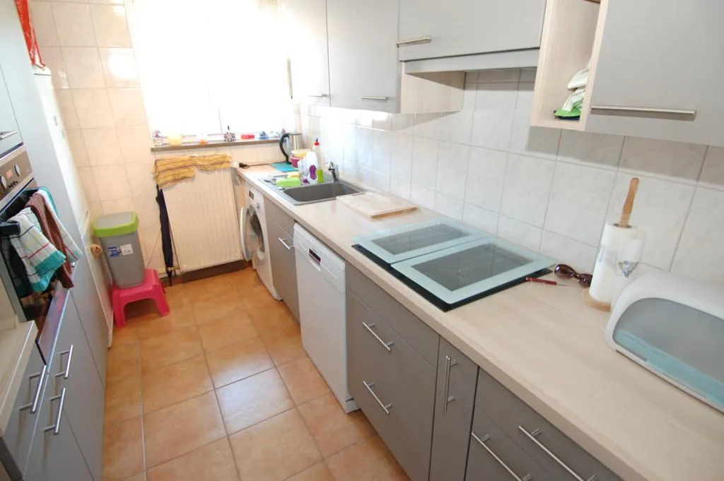 Der Küchenboden ist gefliest. Die Küche ist mit einer Einbauküche mit einer Waschmaschine ausgestattet.