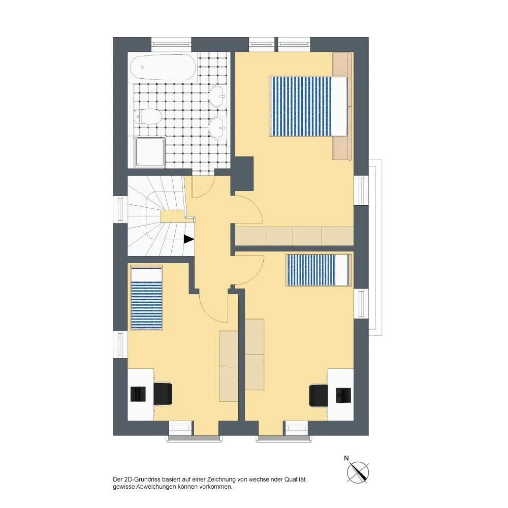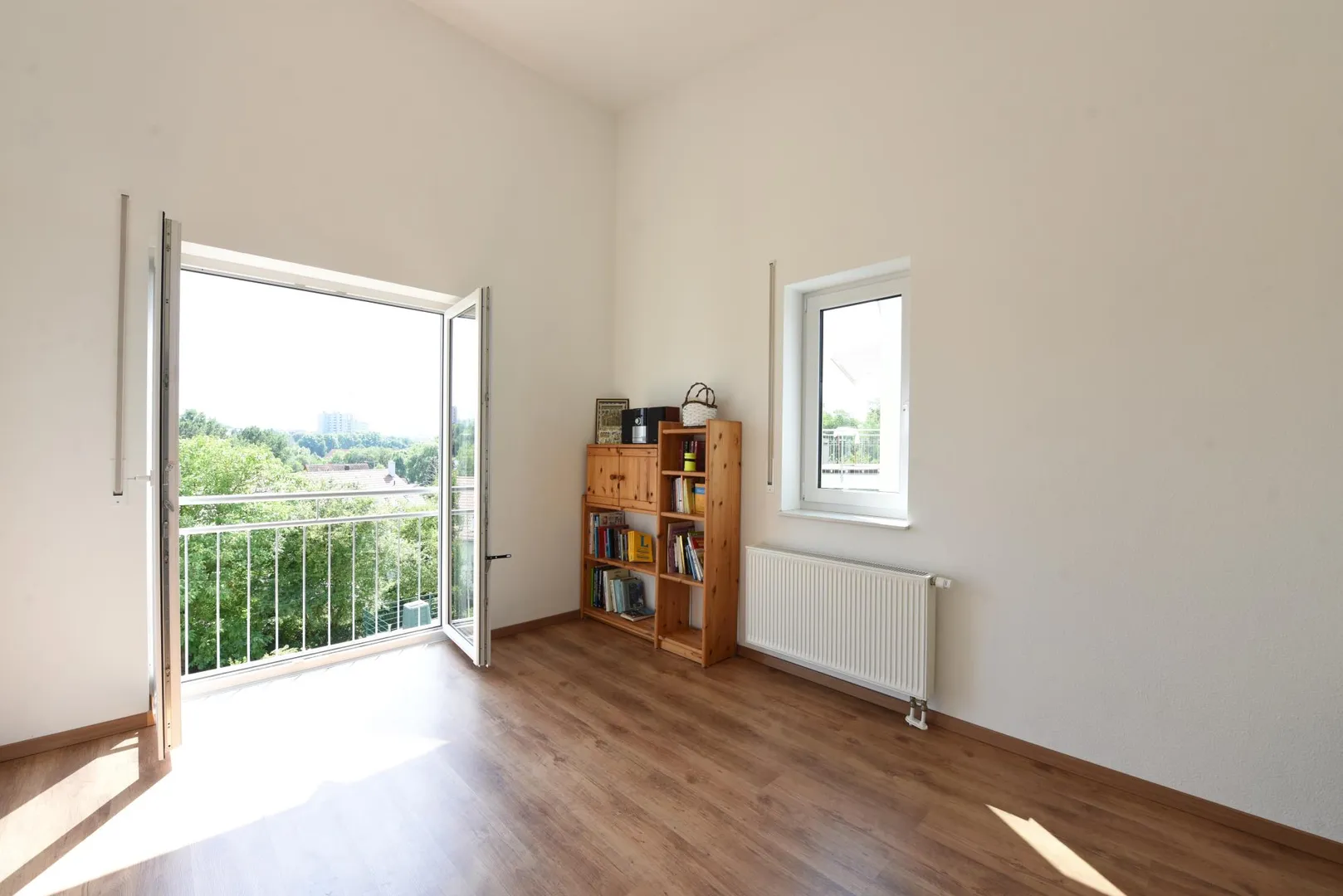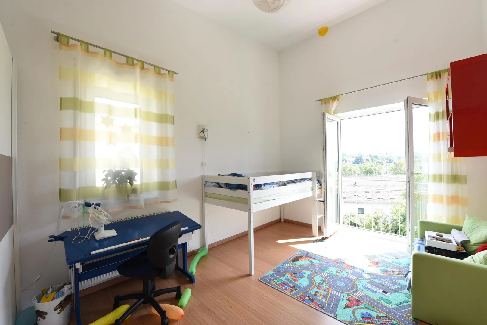 Im Dachgeschoss befinden sich zwei Kinderzimmer mit französischen Balkonen, das Schlafzimmer sowie das Badezimmer mit Fenster. Die Raumhöhen betragen ca. 2,57 bis 3,80 Meter.