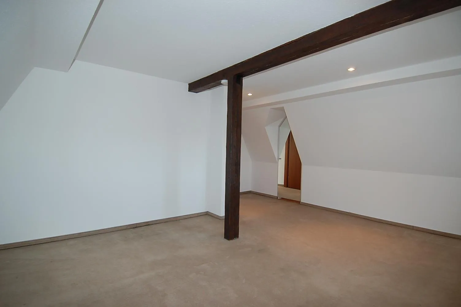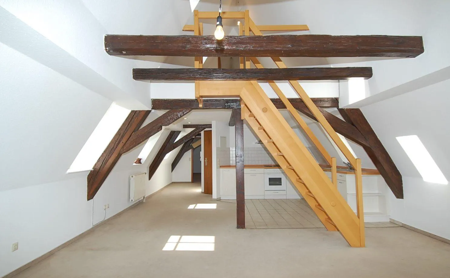 Besonderen Reiz verleihen der Wohnung die freigelegten Balken, der offene Dachspitz, die Galerie und die offene Küche, welche mit dem großen Wohn-Essbereich verbunden ist.