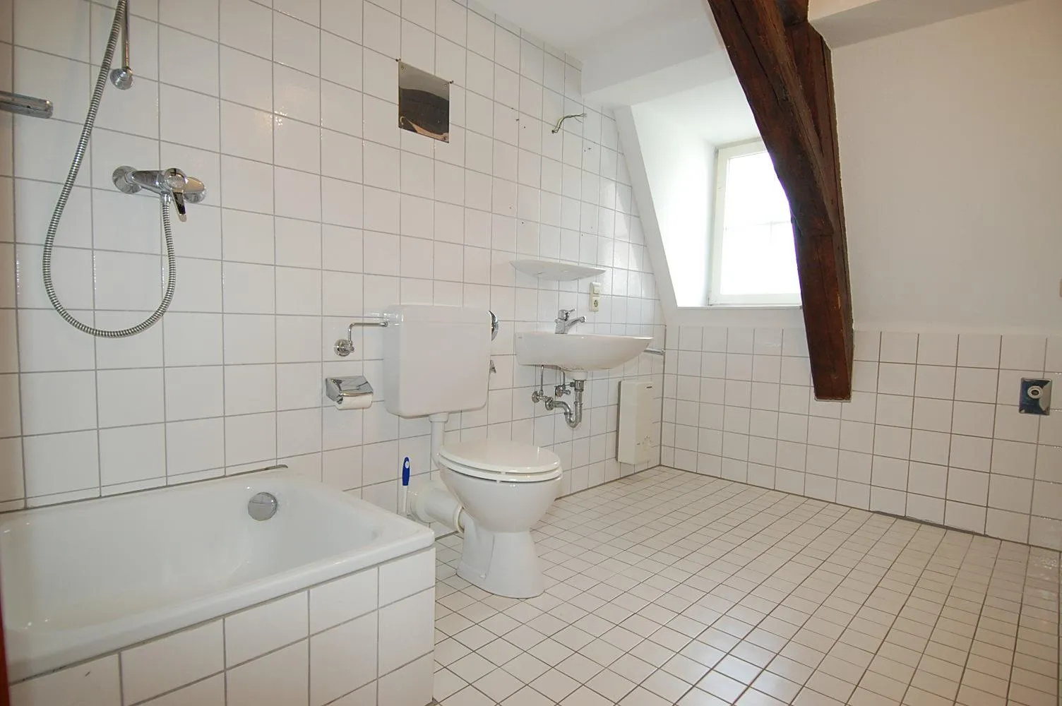 Die Wohnung hat ein raumhoch, weiß gefliestes Badezimmer mit Fenster. Das Badezimmer ist ausgestattet mit einer Dusche und einen Waschmaschinenplatz.