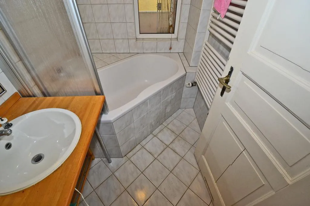 Das raumhoch geflieste, ca. 3 m² kleine Badezimmer mit Fenster ist ausgestattet mit einer Eckwanne mit Duschmöglichkeit, einem Waschbecken, einem Fliesenboden sowie einem Handtuchheizkörper. Das Badezimmer wurde in den 90-er Jahren modernisiert. Das separate WC mit Fenster ist mit einem Fliesenboden ausgestattet.