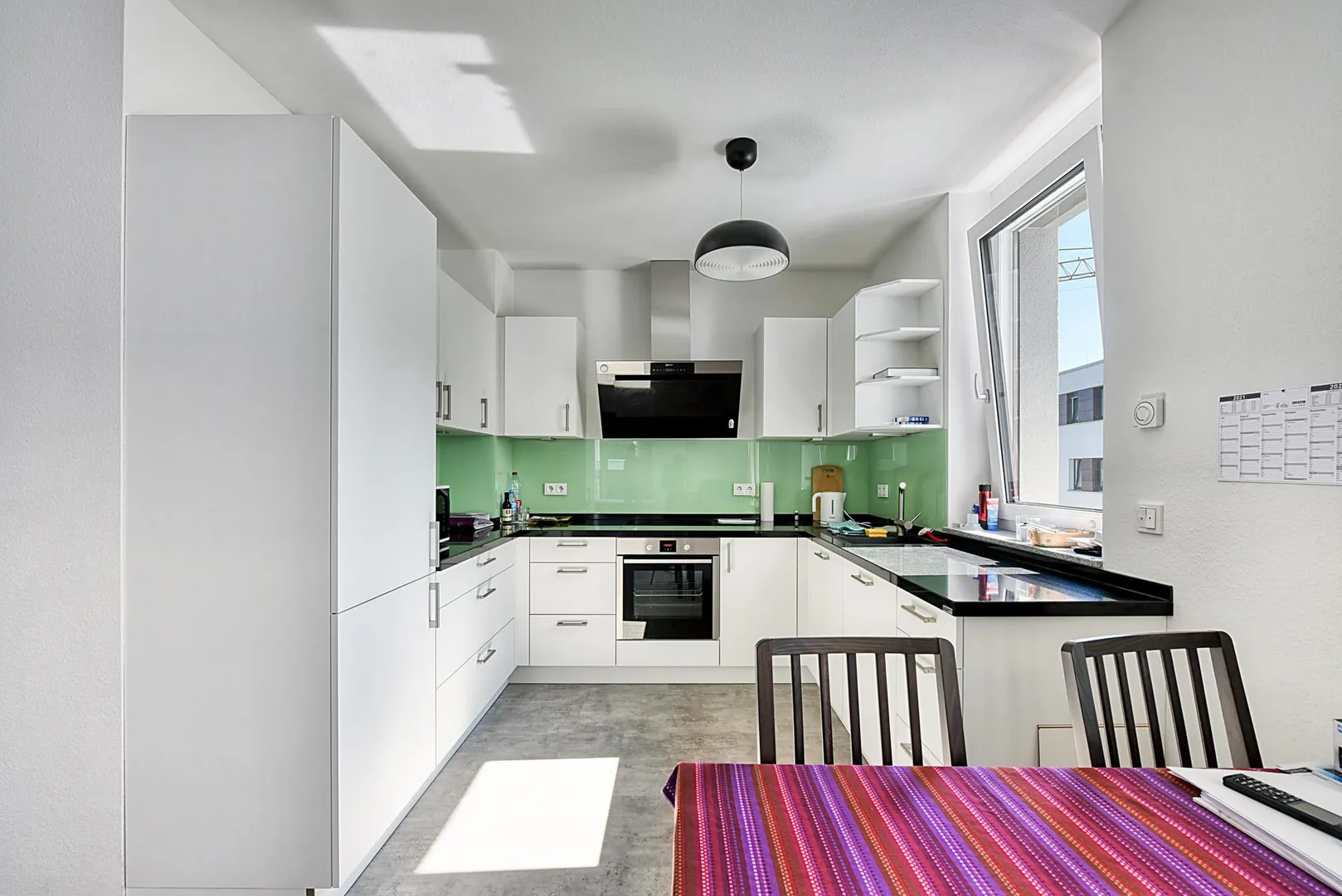 Die Küche verfügt über eine hochwertige Einbauküche. Die Einbauküche ist ausgestattet mit einem Kühlschrank und Gefrierschrank, einer Spülmaschine, einem Herd mit Backofen, einer Dunstabzugshaube sowie Ober- und Unterschränken.