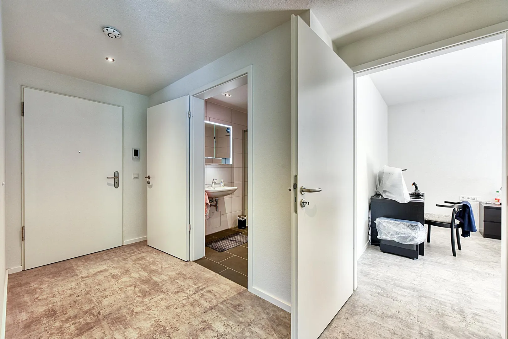 Alle Zimmer und der Flur sind mit hochwertigen Bio-Design-Vinylböden ausgestattet. Die Wände sind mit Raufasertapeten tapeziert und weiß gestrichen.