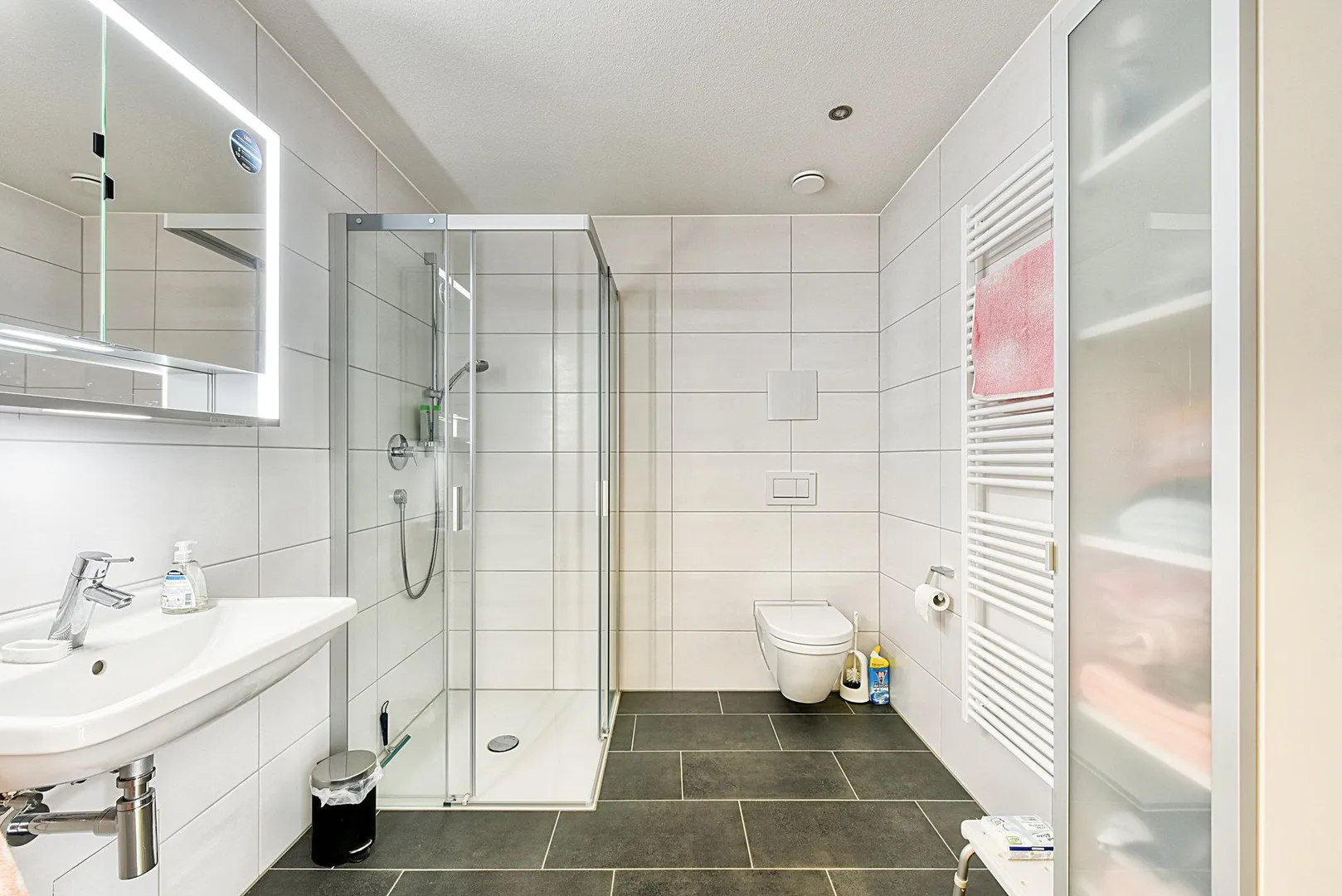Das raumhoch geflieste Badezimmer ist ausgestattet mit einem Fliesenboden, einer bodentiefen Dusche, einem WC, einem Handtuch-Heizkörper sowie einem Spiegelschrank.