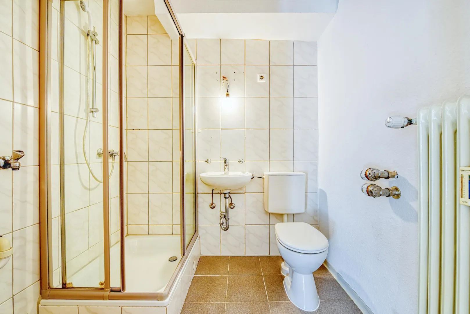 Das raumhoch geflieste Badezimmer mit Fliesenboden wurde ca. 2008 modernisiert und ist mit einer Dusche, einem WC und einem Waschmaschinenanschluss ausgestattet.