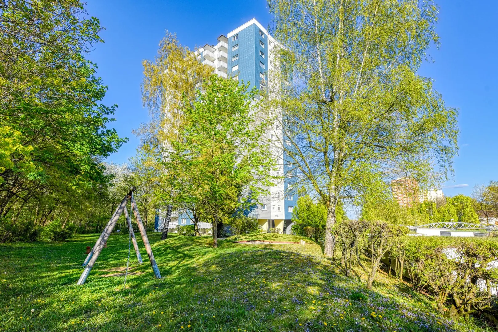 Das Hochhaus liegt in einer Alleinlage direkt am Waldrand.