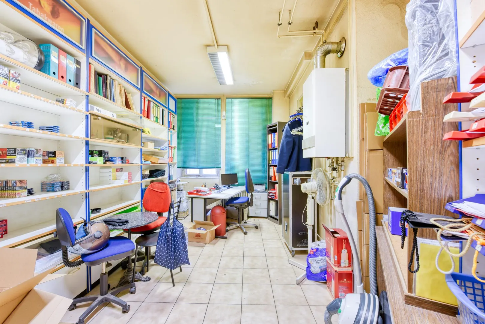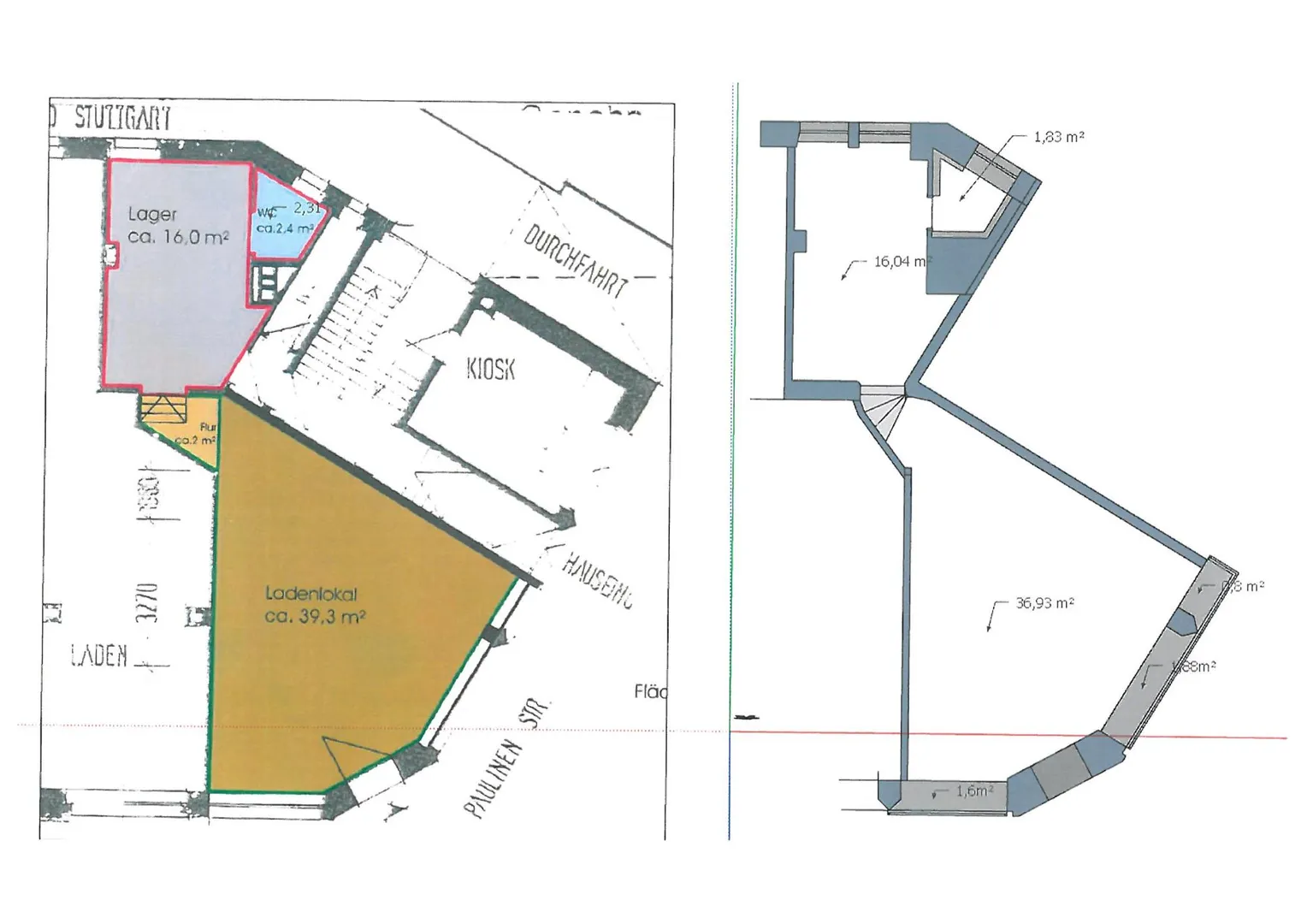 Der Ladenbereich ist ca. 39 m² groß. Der hintere Raum ist ca. 16 m² groß, verfügt über Holzfenster und kann als Büro oder Lager genutzt werden.