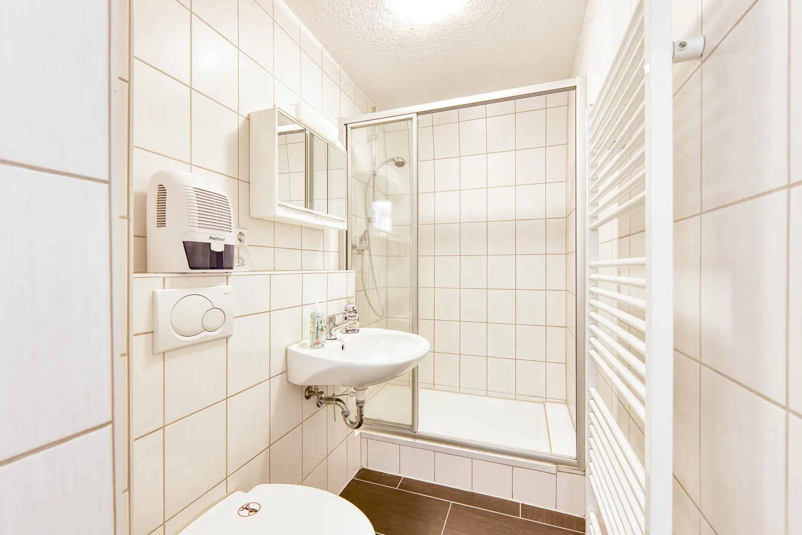 Das raumhoch geflieste Badezimmer ist ausgestattet mit einer Dusche, einem WC, einem Handtuch-Heizkörper, einem Spiegelschrank sowie einem Waschtisch-Unterschrank.